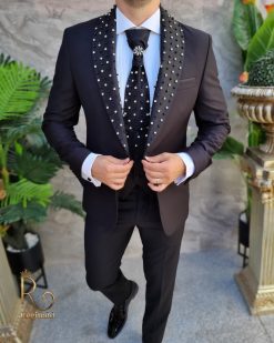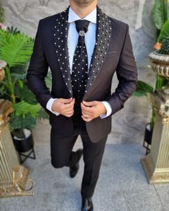 Sacoul este cu rever spitz avand pietre stralucitoare aplicate pe el