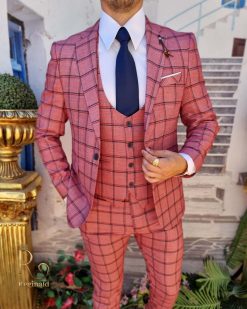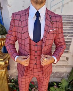 Costum de bărbați, Slim Fit, Gri in carouri, Sacou, Vesta si Pantalon – C3548