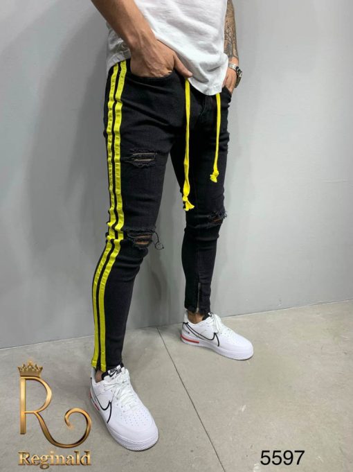 Blugi de bărbați Premium, negri cu snur si dungi galbene, conici si elastici – BG719