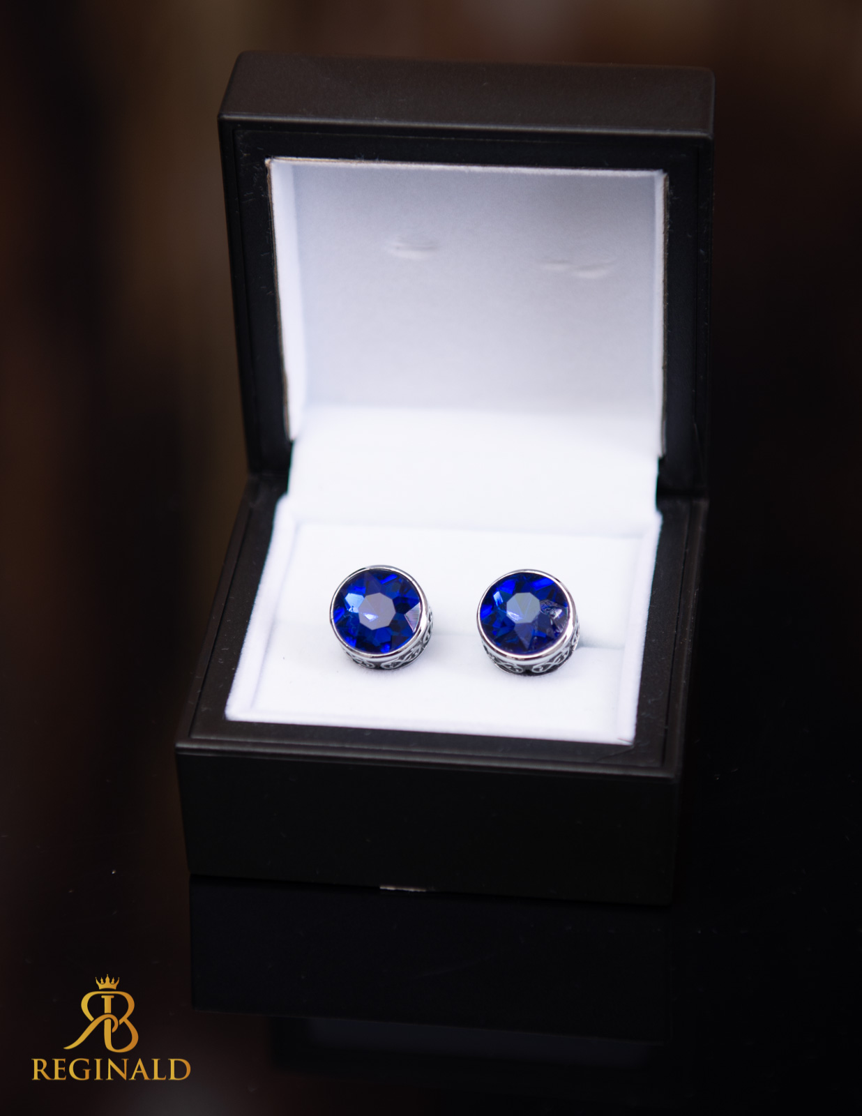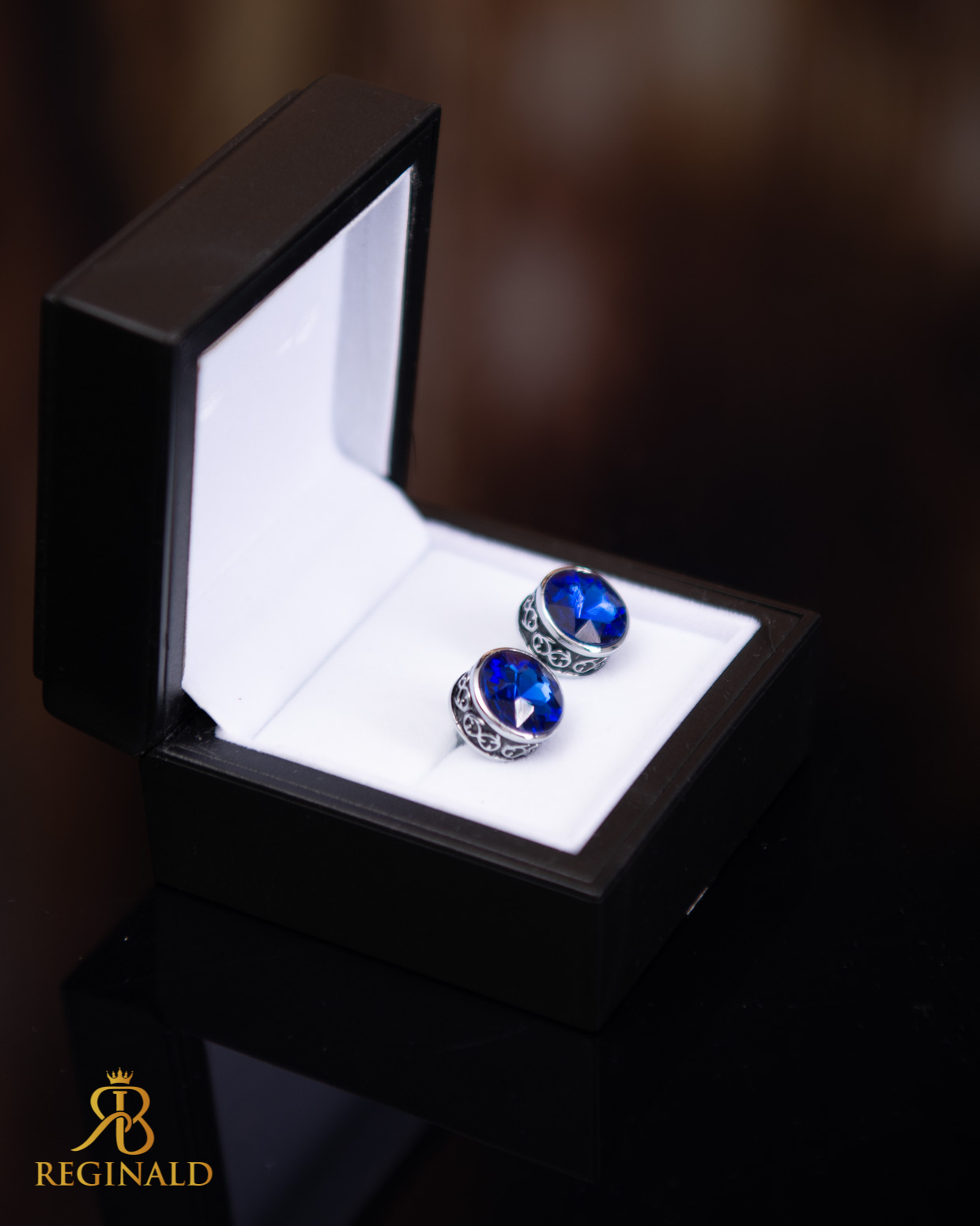 Butoni argintii cu pietre albastre, potriviți pentru ocazii formale sau festive. Se fixează ușor la manșetă cu o cheie pliabilă.