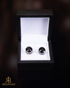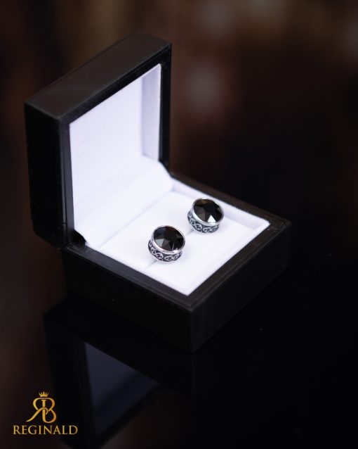 Butoni argintii cu pietre negre, potriviți pentru ocazii formale sau festive. Se fixează ușor la manșetă cu o cheie pliabilă.