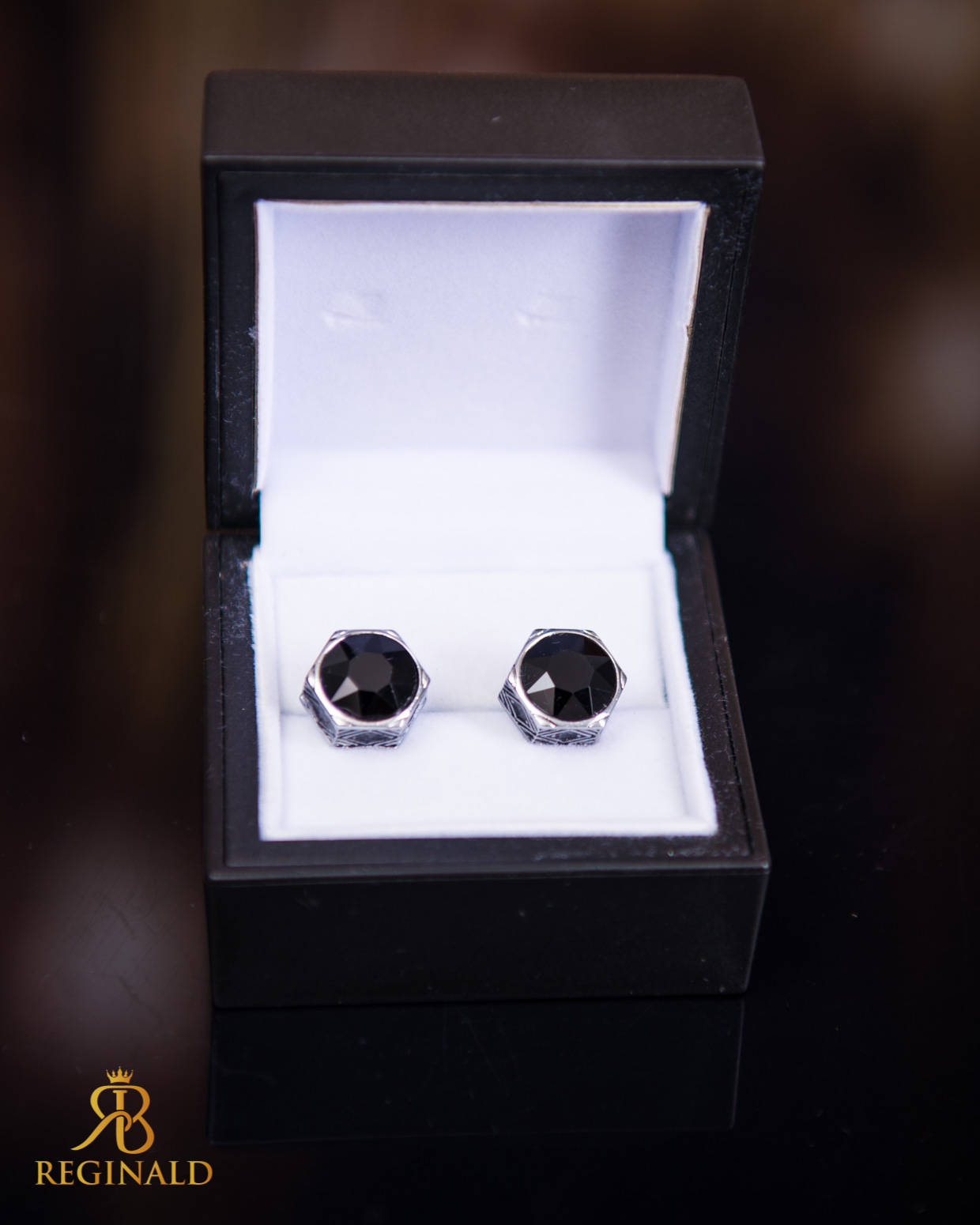 Butoni argintii cu pietre negre, potriviți pentru ocazii formale sau festive. Se fixează ușor la manșetă cu o cheie pliabilă.