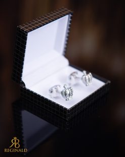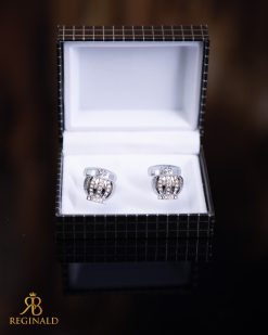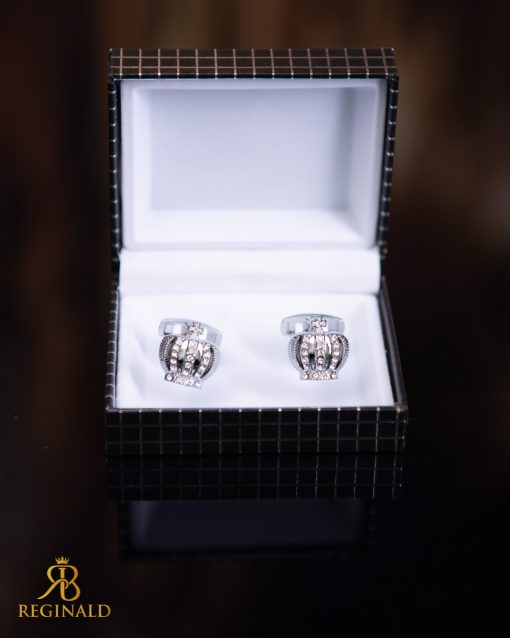 Butoni argintii cu pietre cu stralucitoare, potriviți pentru ocazii formale sau festive. Se fixează ușor la manșetă cu o cheie pliabilă.