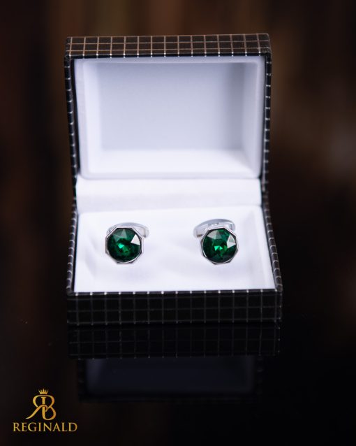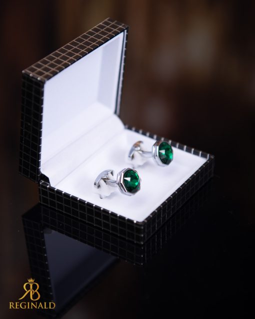 Butoni argintii cu pietre cu verzi, potriviți pentru ocazii formale sau festive. Se fixează ușor la manșetă cu o cheie pliabilă.