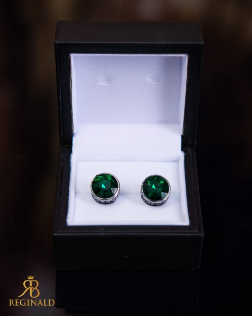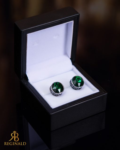 Butoni argintii cu pietre verzi, potriviți pentru ocazii formale sau festive. Se fixează ușor la manșetă cu o cheie pliabilă.