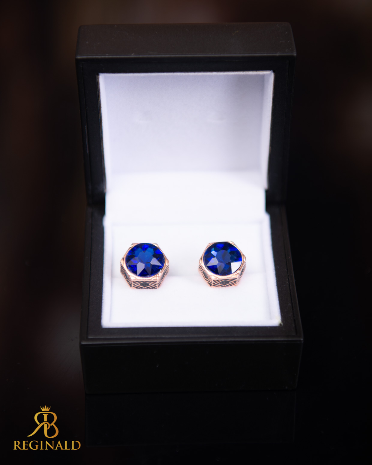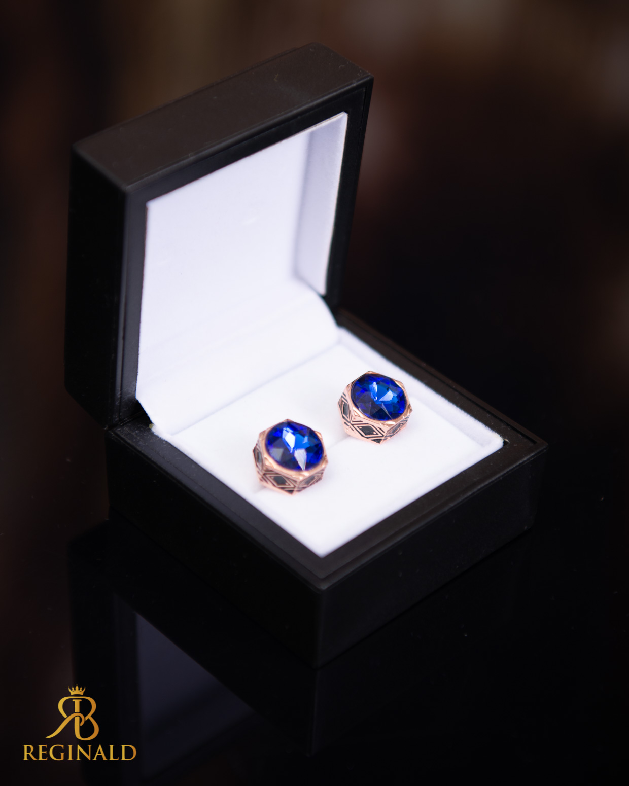 Butoni aurii cu pietre albastre, potriviți pentru ocazii formale sau festive. Se fixează ușor la manșetă cu o cheie pliabilă.