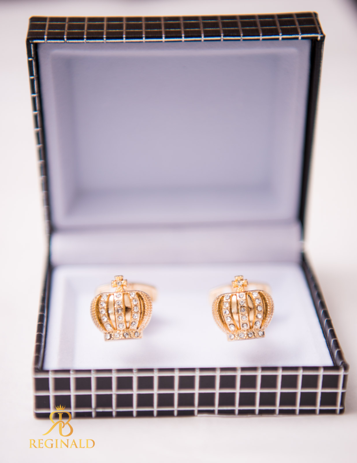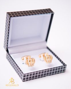 Butoni aurii cu pietre stralucitoare, potriviți pentru ocazii formale sau festive. Se fixează ușor la manșetă cu o cheie pliabilă.