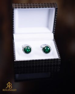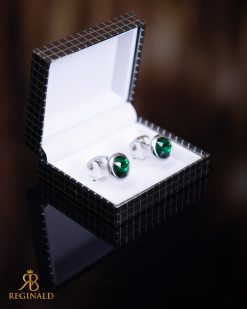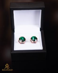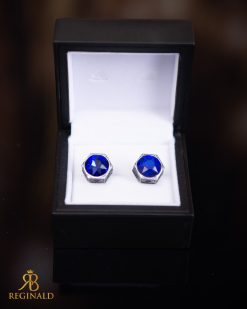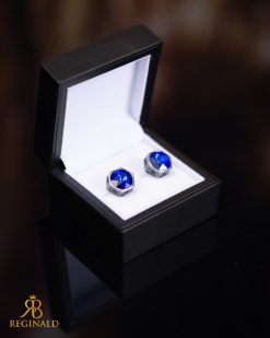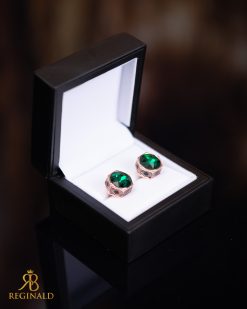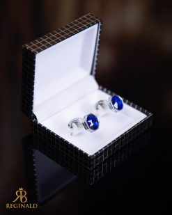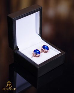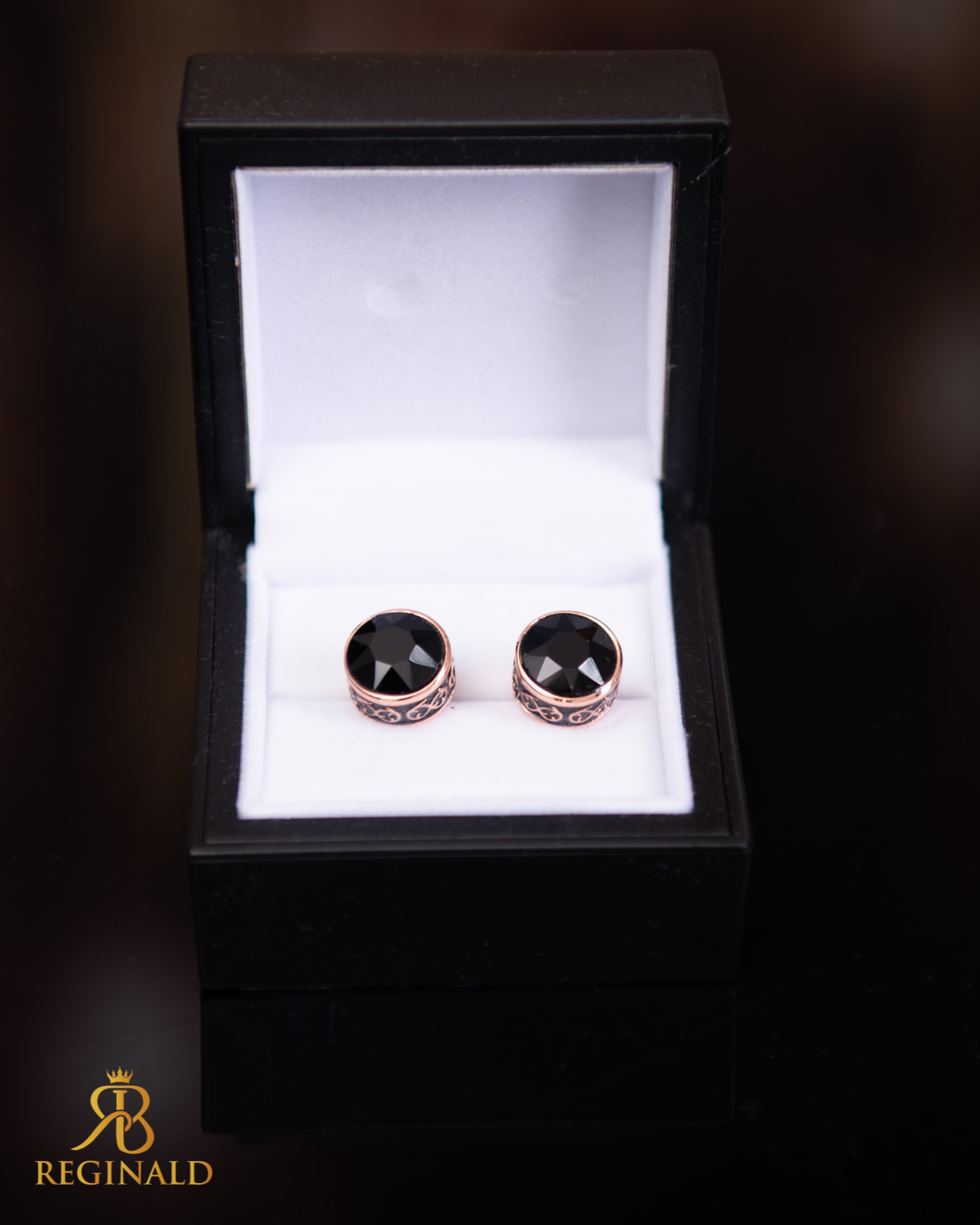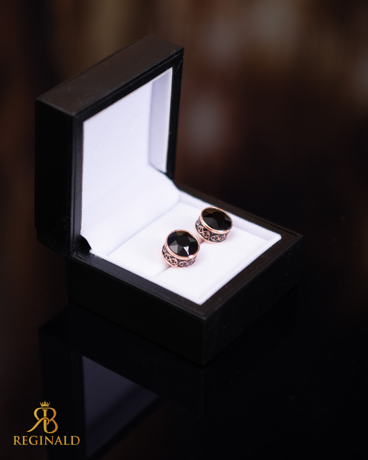 Butoni aurii cu pietre negre, potriviți pentru ocazii formale sau festive. Se fixează ușor la manșetă cu o cheie pliabilă.