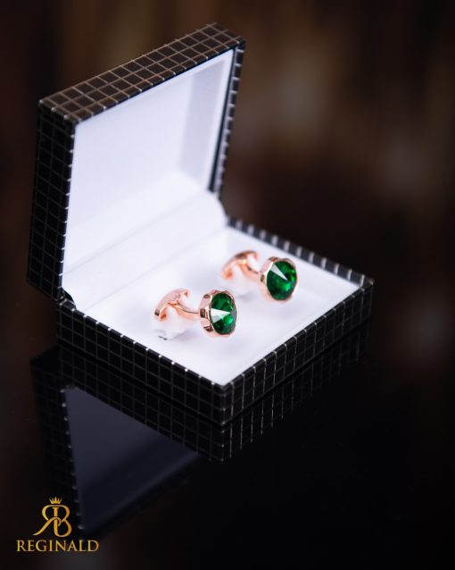 Butoni aurii cu pietre verzi, potriviți pentru ocazii formale sau festive. Se fixează ușor la manșetă cu o cheie pliabilă.