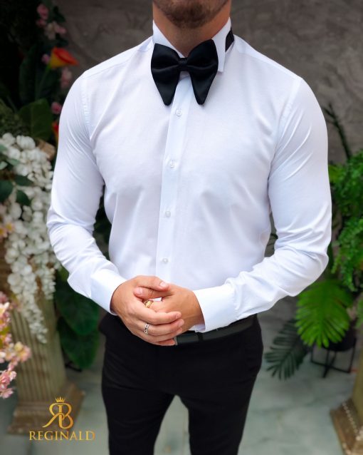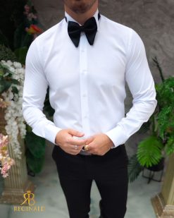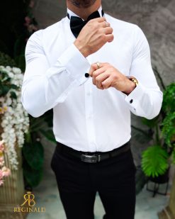 Cămașa albă pentru bărbați cu butoni și guler de papion este o alegere elegantă pentru evenimente formale sau ocazii speciale. Această cămașă are de obicei un guler ascuțit, care poate fi îndreptat în sus pentru a oferi suport pentru papion.