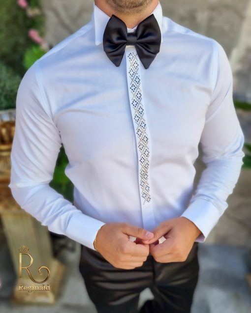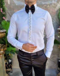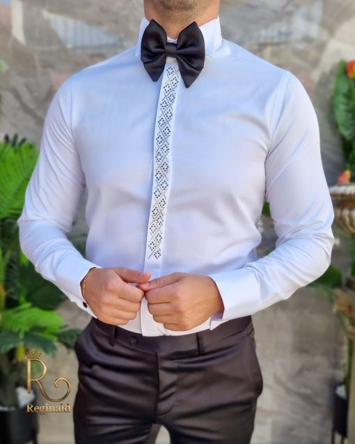 Camasa alba slim-fit, de ceremonie cu butoni, pentru papion ginere/nas