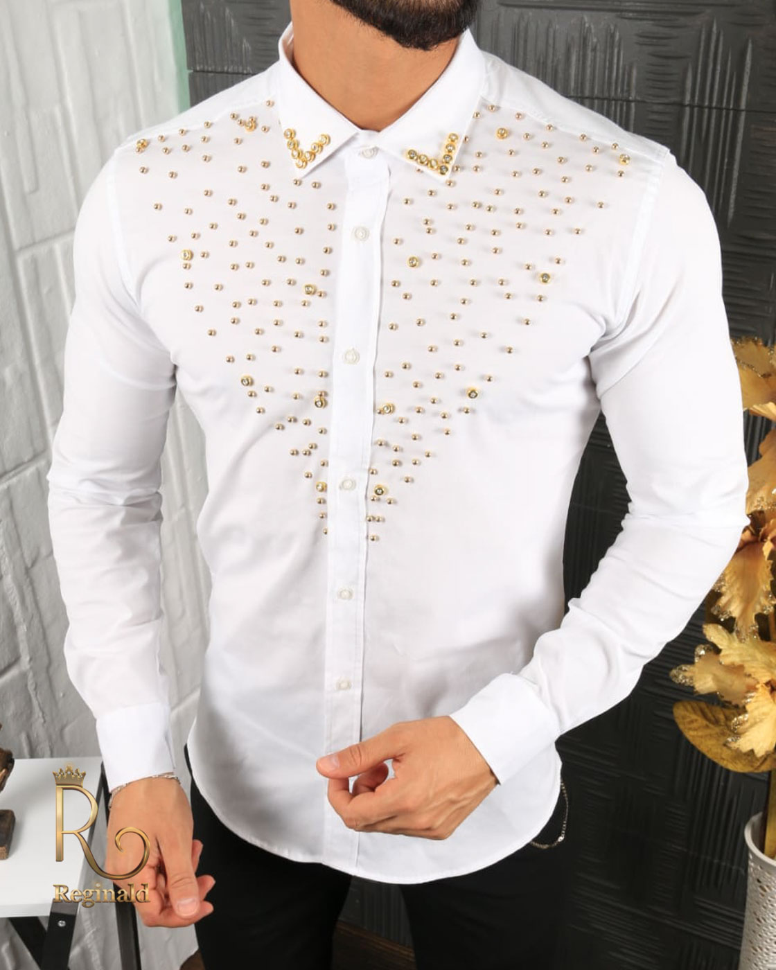 Camasa de barbati alba cu tinte aurii aplicate pe guler si piept
