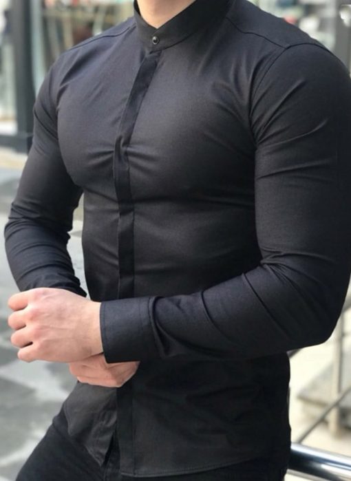 Cămașă Bărbați Slim Fit neagra cu tunica, nasturi ascunsi, croiala slim fit