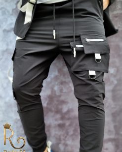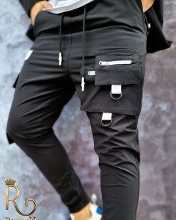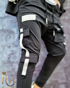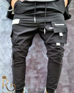 Pantalonii sunt cu semi-tur, au o croiala slim fit, conica la glezne, cu snur, buzunare laterla si in fata, cu fermoar alb. Bata elastica la glezne si in talie.