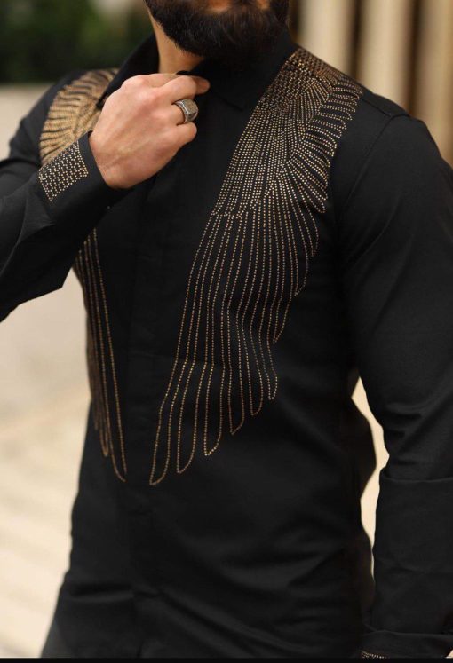 Camasa slim fit de barbati, neagra cu model si pietre aurii- CM539