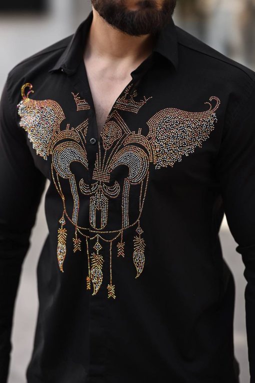 Camasa slim fit de barbati, neagra cu model si pietre – CM540