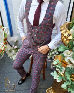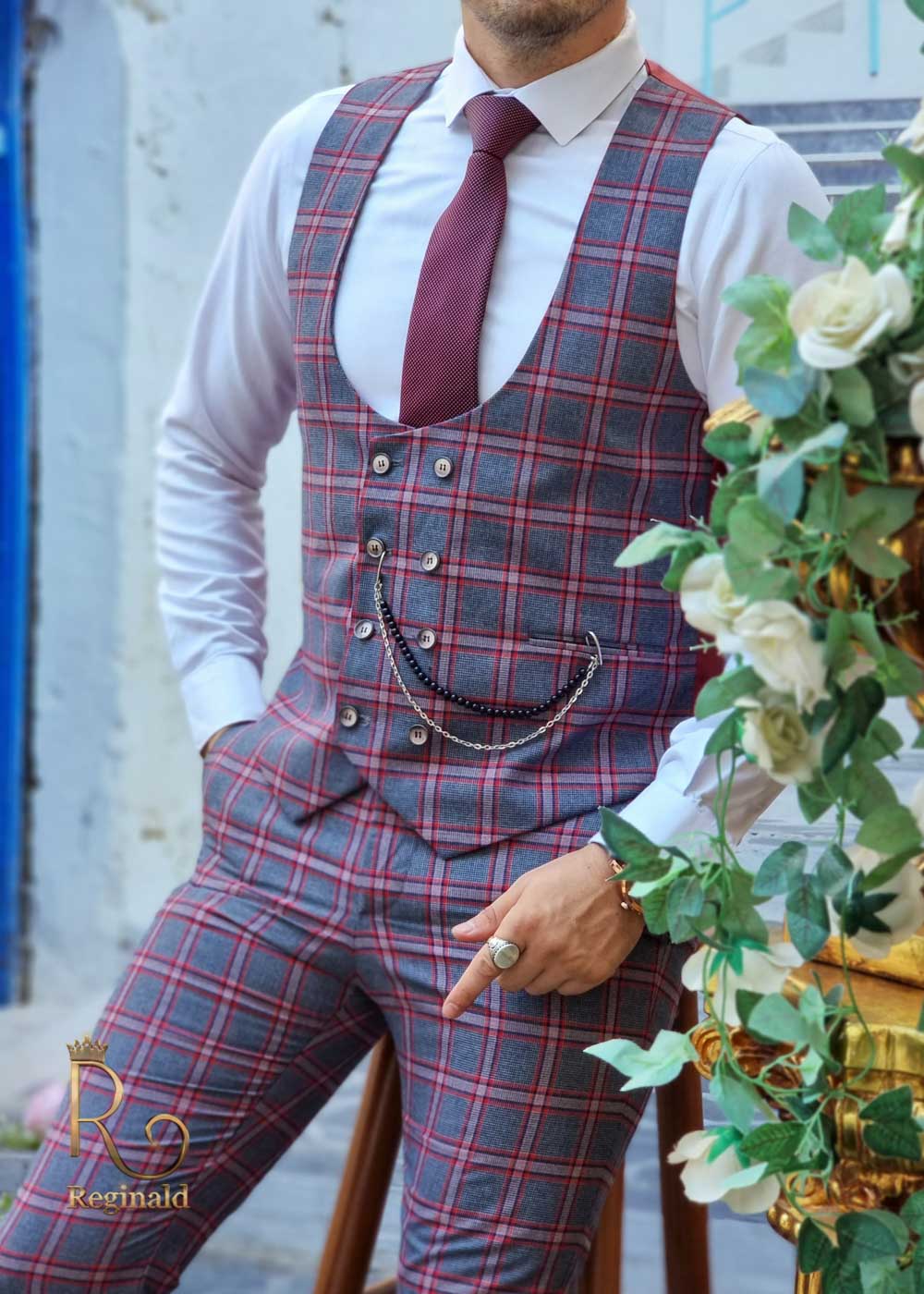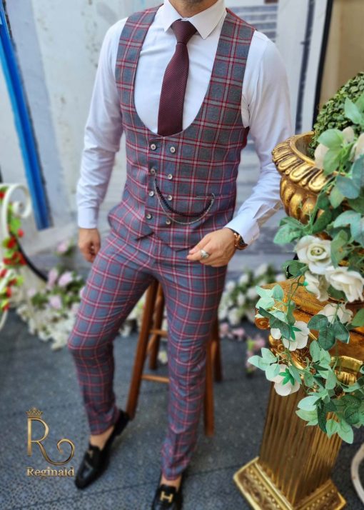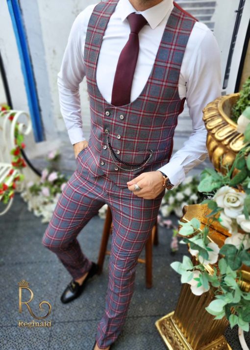 Compleu de barbati Vesta si Pantalon gri in carouri rosii, Slim Fit – CU183