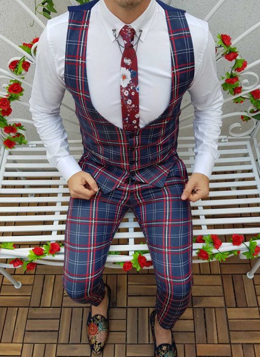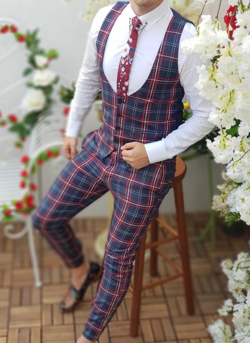 Compleu Vesta si Pantalon, Slim Fit, bleumarin in carouri – CU16