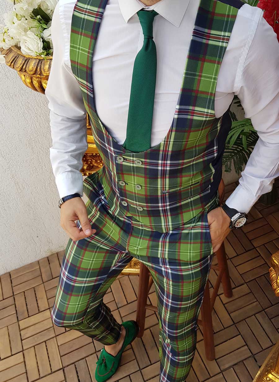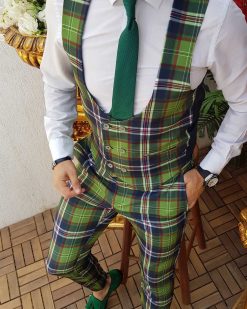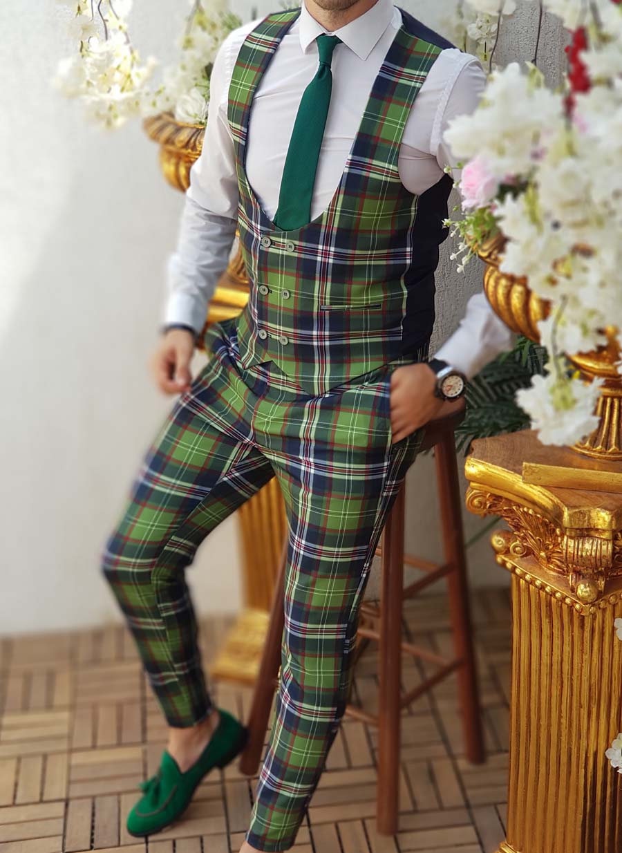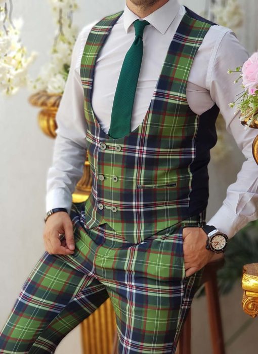 Compleu Vesta si Pantalon, Slim Fit, verde in carouri bleumarin – CU70