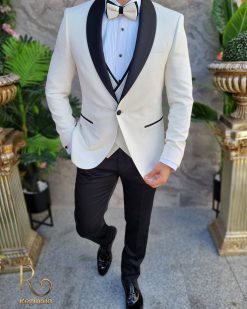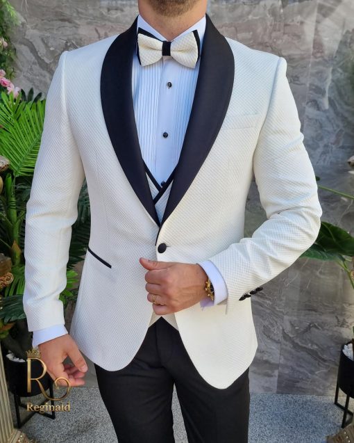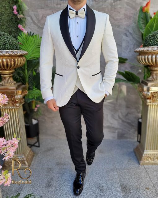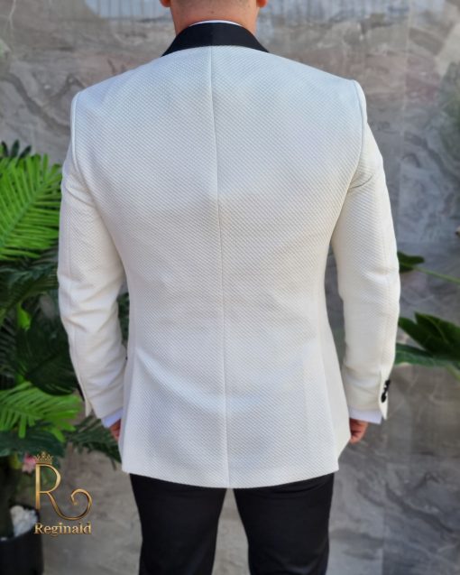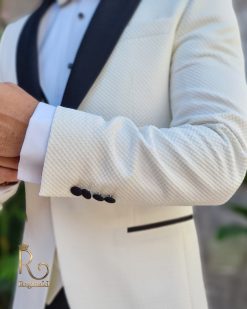 Sacoul este cu rever negru, spitz avand o croiala cambrata pe langa corp, o tesatura elastica si aerisita special pentru sezonul cald