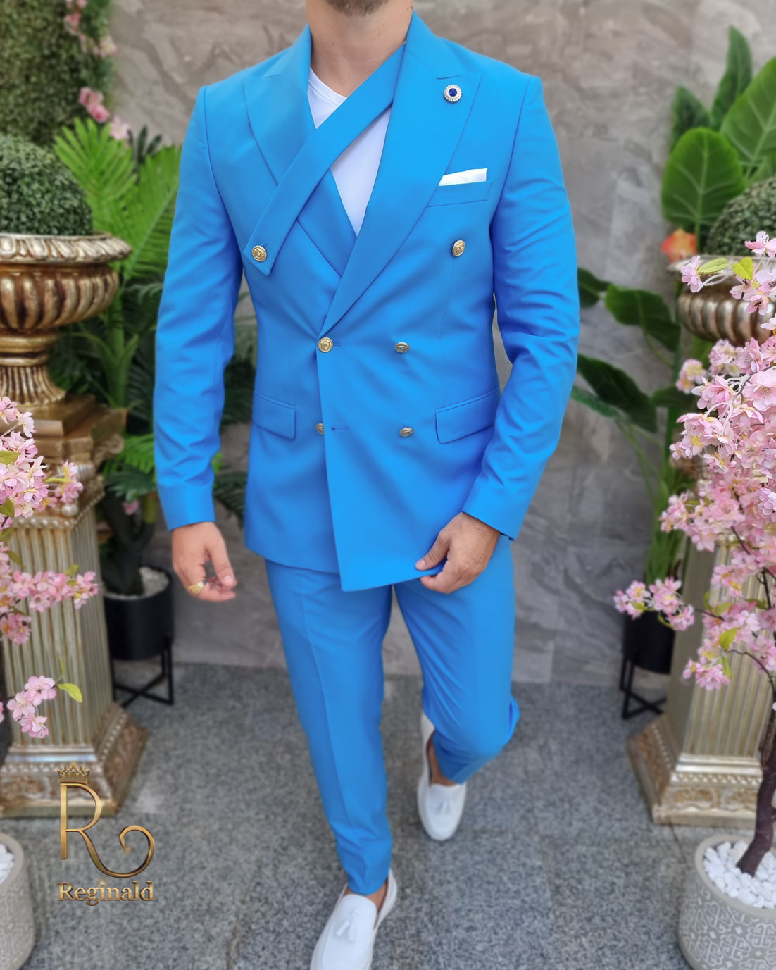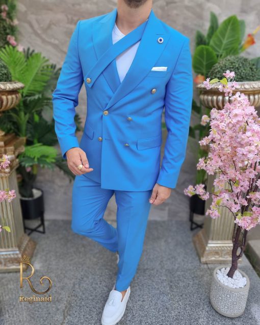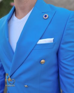 Sacoul prezintă un aspect clasic cu rever lat și se închide cu 2 randuri de nasturi, avand si o bata care se poate atasata pe rever. Manșetele discrete completează designul, oferind un aspect sofisticat și stilizat. Datorită croielii slim-fit, sacoul se mulează perfect pe corpul bărbatului, evidențiind forma sa și oferind o notă de eleganță contemporană.