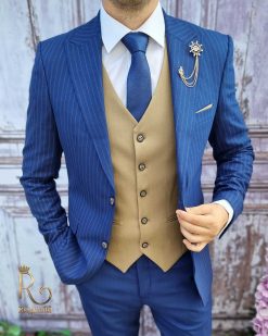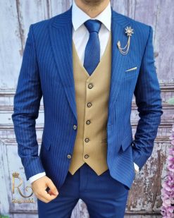 Costum barbatesc slim-fit albastru, Sacou in dungi + Vesta + Pantalon – C3132