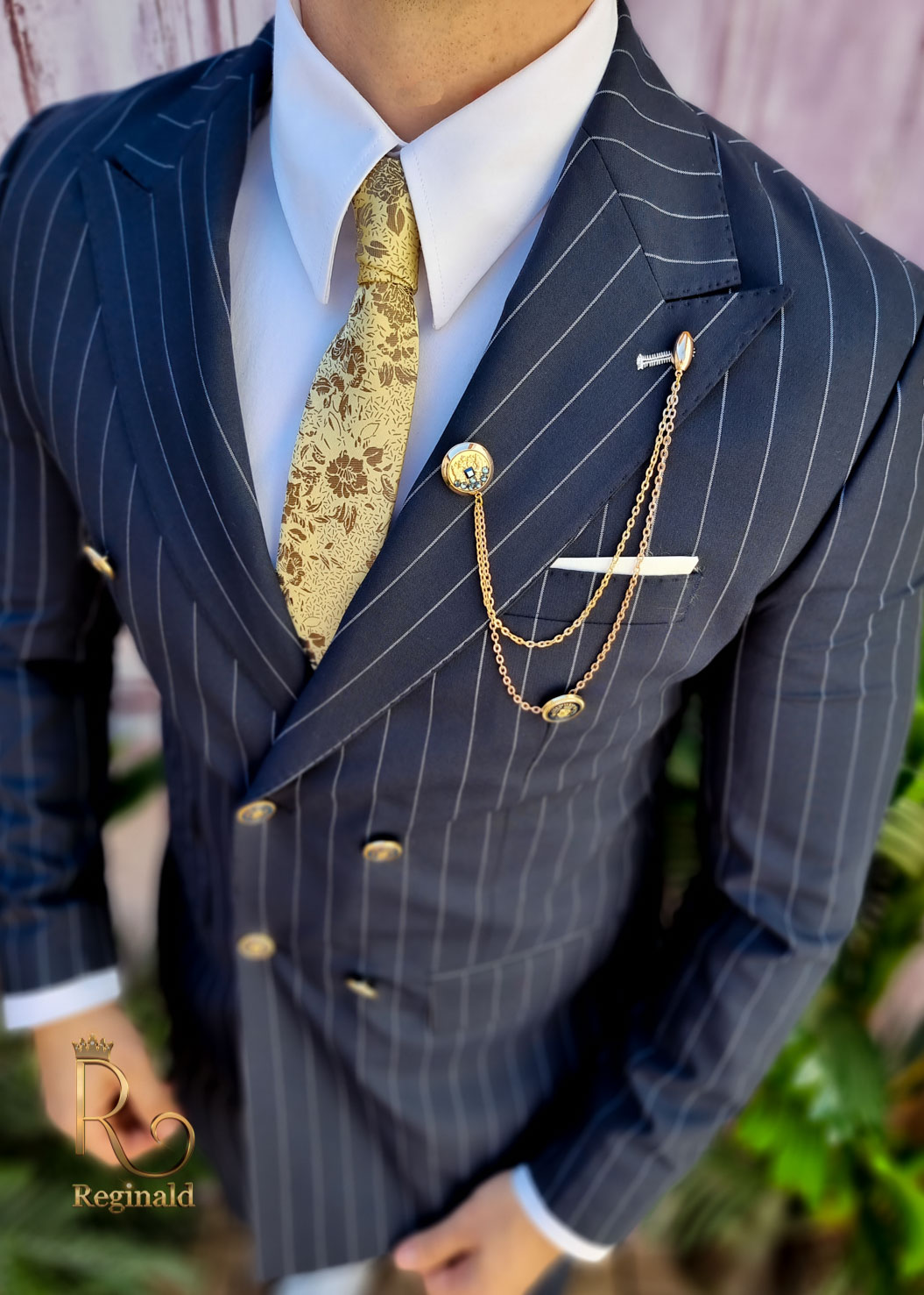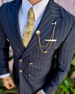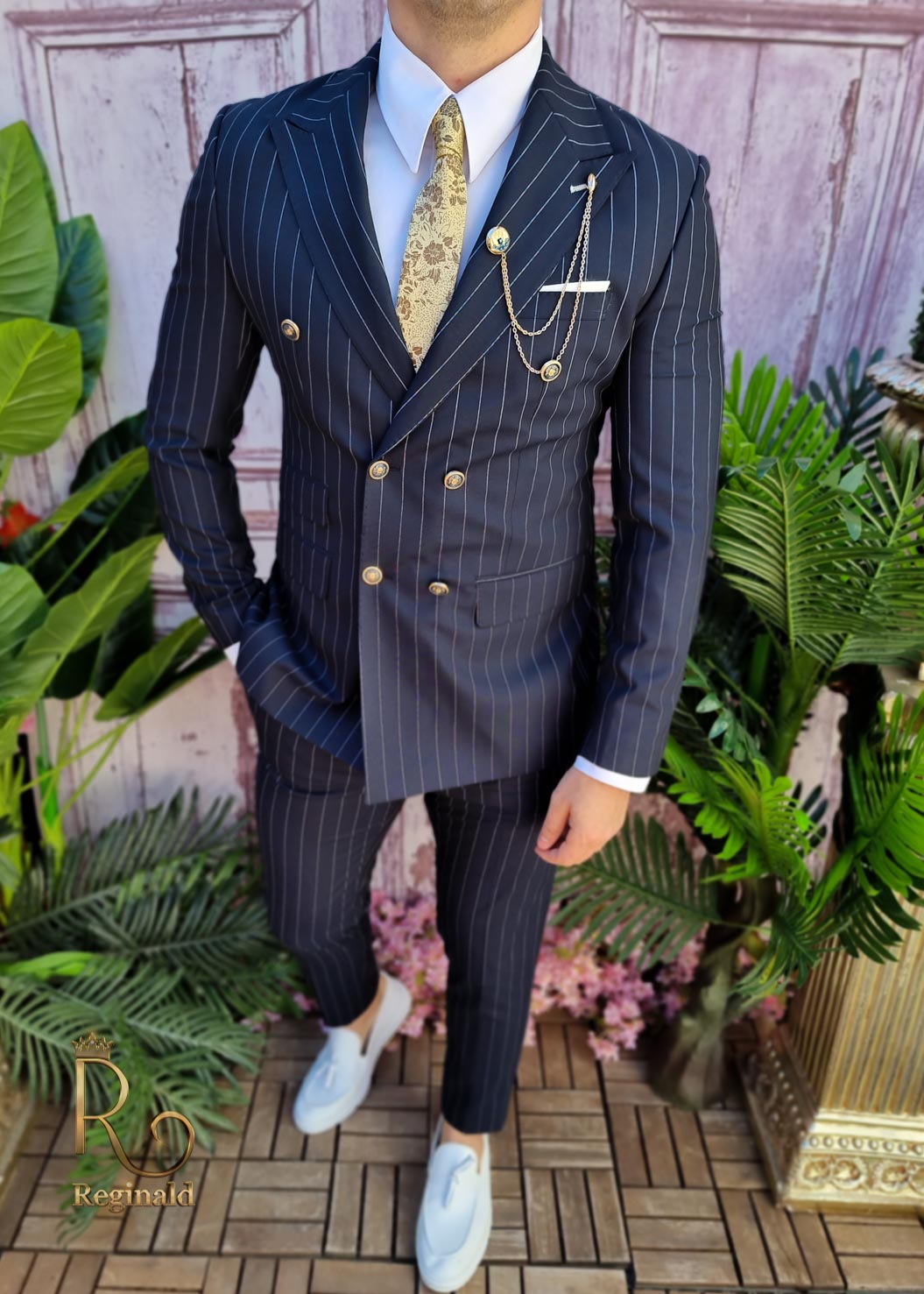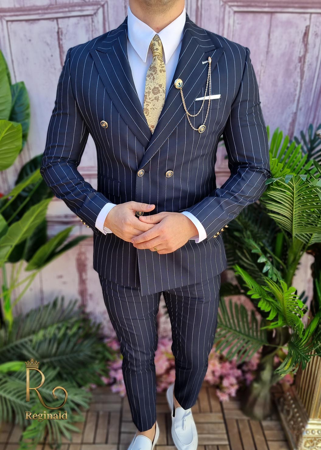 Costumul bleumarin în dungi cu două rânduri de nasturi, numit și double-breasted, este o alegere clasică și sofisticată pentru bărbații care doresc să arate eleganți și rafinați.