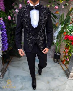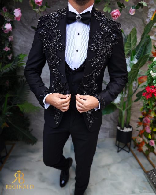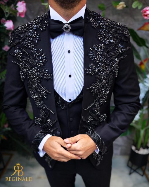 Culoarea: model negru cu pietre stralucitoare aplicate pe sacou si papion