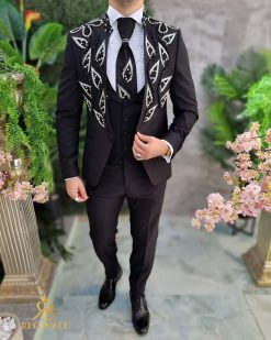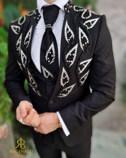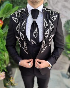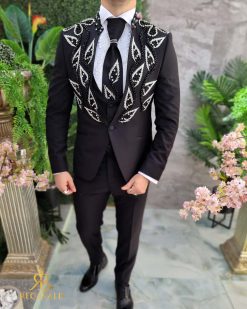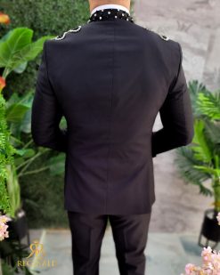 Culoarea: model negru cu pietre stralucitoare aplicate pe sacou si cravata