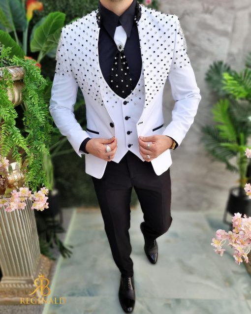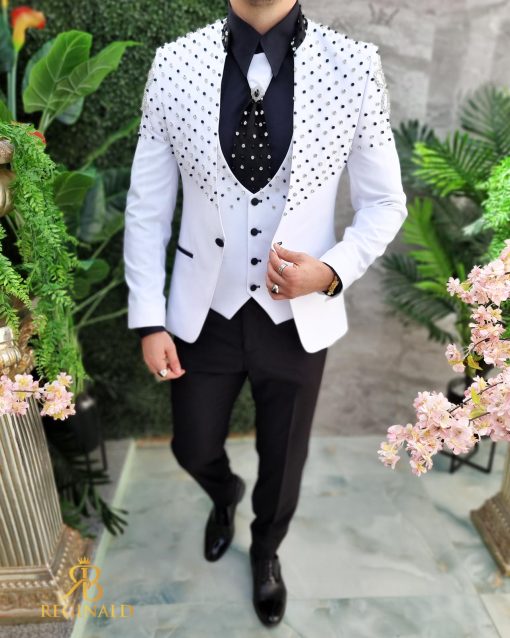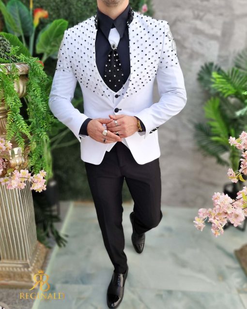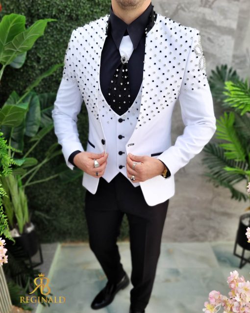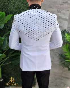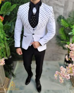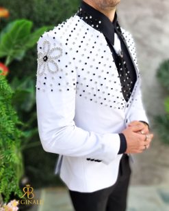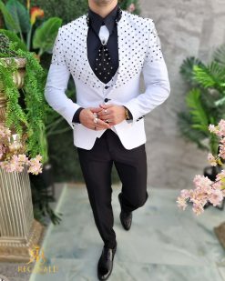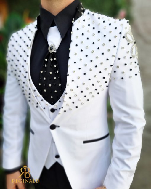 Culoarea: model alb/negru cu pietre stralucitoare aplicate pe sacou si cravata