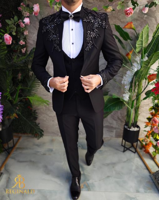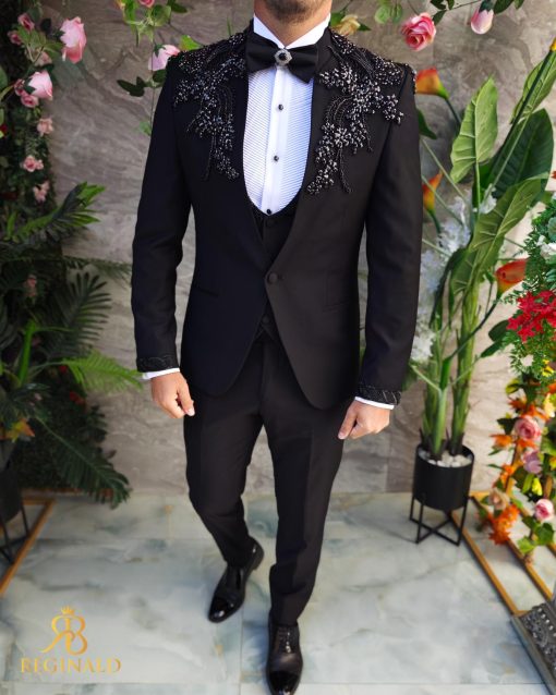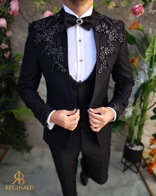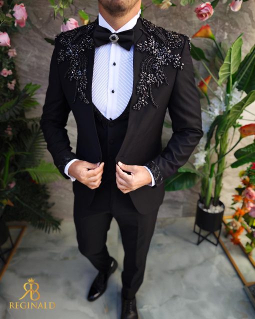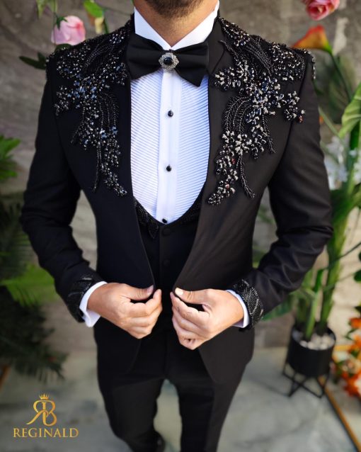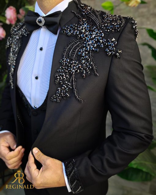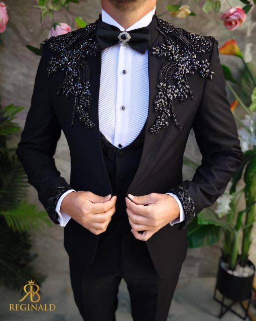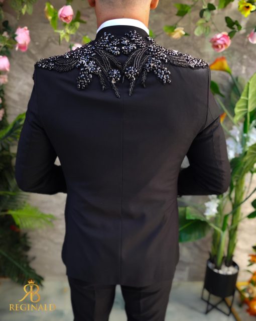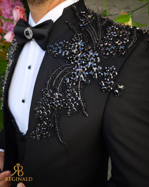 Culoarea: model negru cu pietre stralucitoare aplicate pe sacou si papion