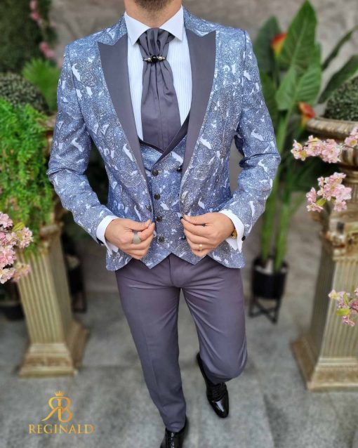 Nuanta: gri cu model bleu/gri pe sacou si vesta