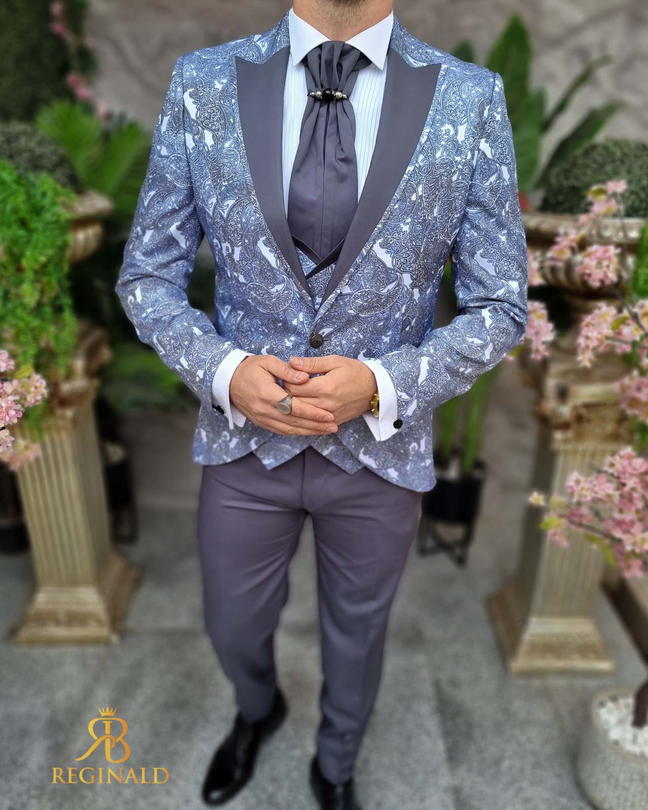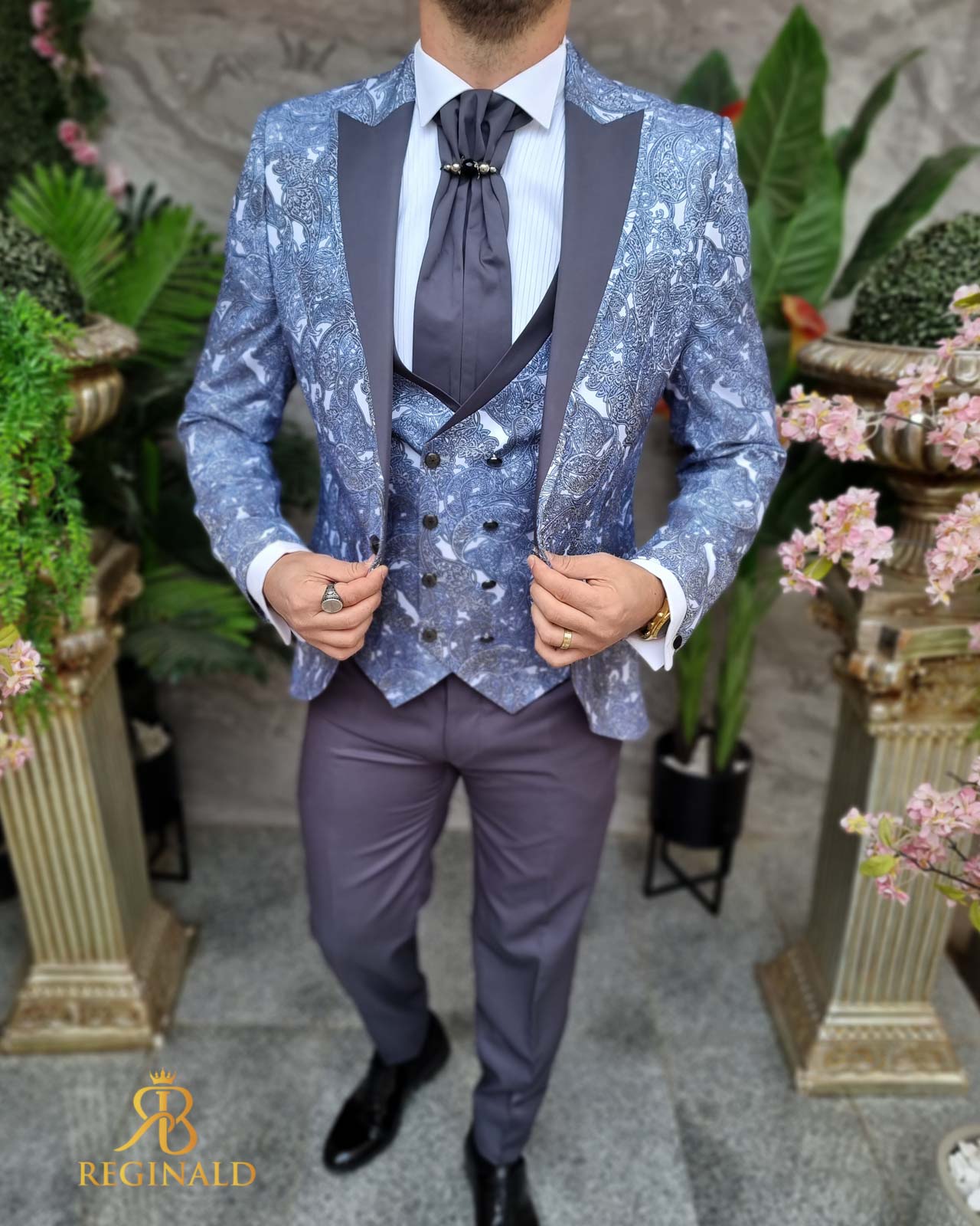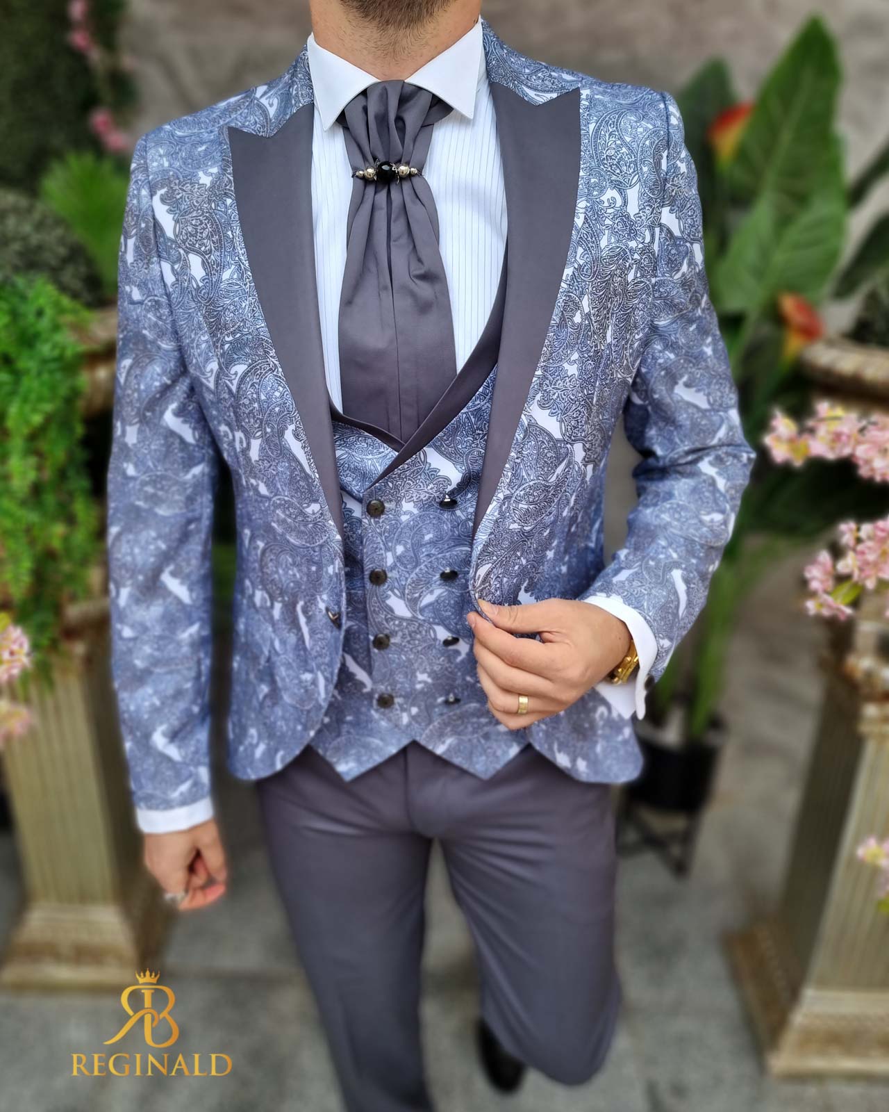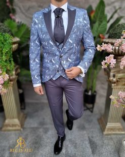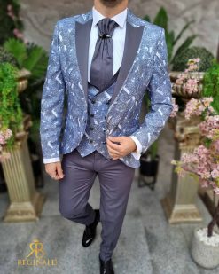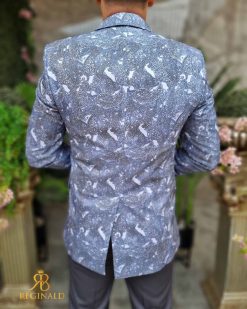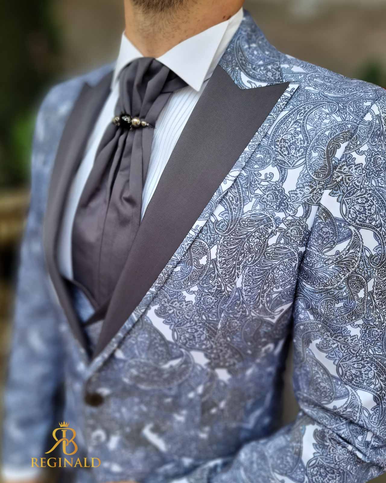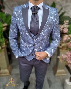 Nuanta: gri cu model bleu/gri pe sacou si vesta
