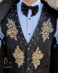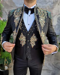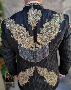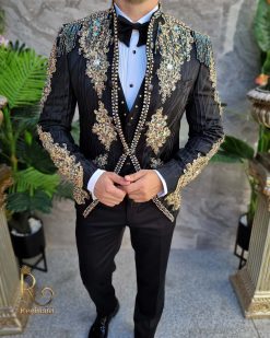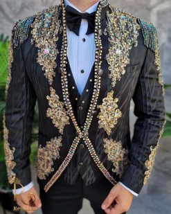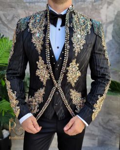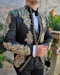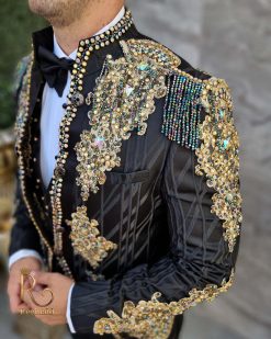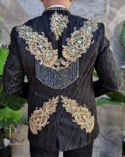 Sacoul este cu tunica, are pietre aplicate pe tot materialul, inclusiv pe spate.