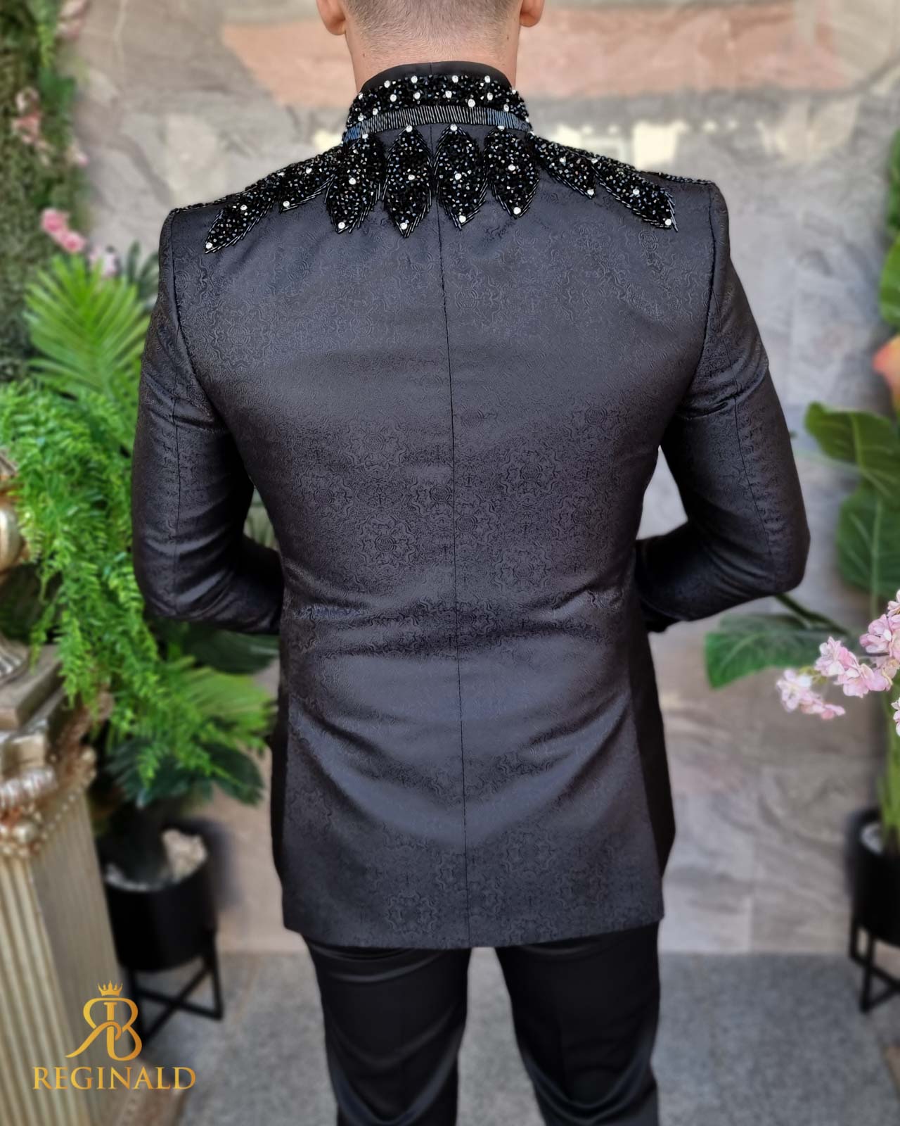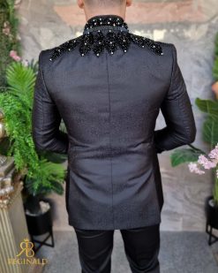 Sacoul este tip tunica, material in relief, imbracat in pietre stralucitoare