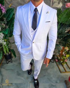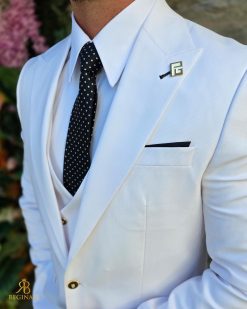 Costum de bărbați, alb cu nasturi aurii : Sacou, Vesta si Pantalon – C5304