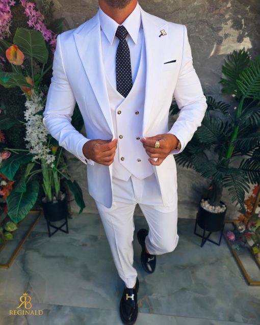 Costum de bărbați, alb cu nasturi aurii : Sacou, Vesta si Pantalon – C5304