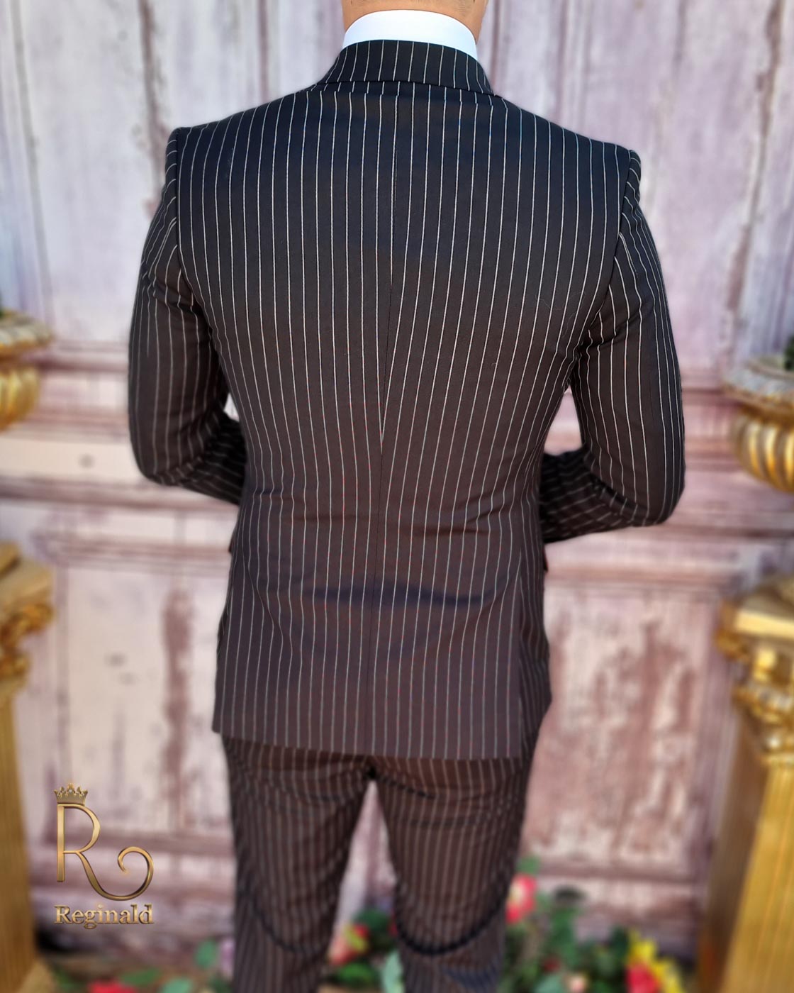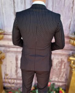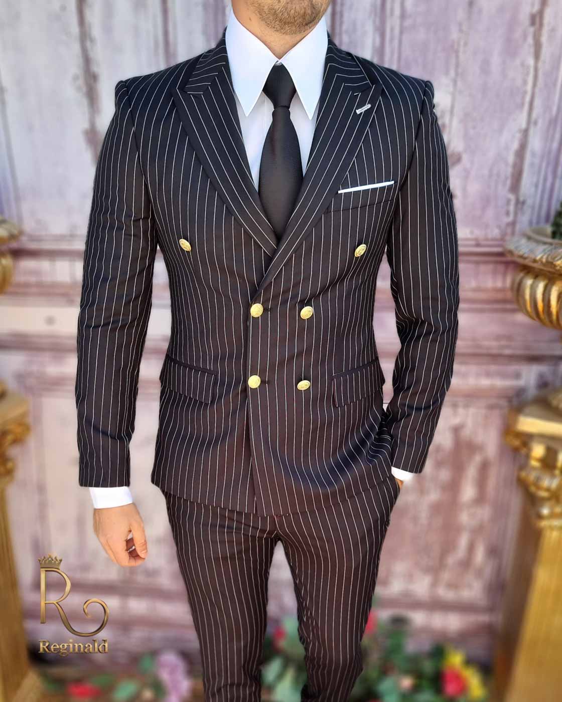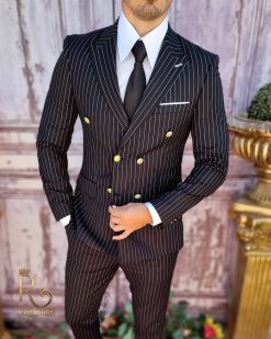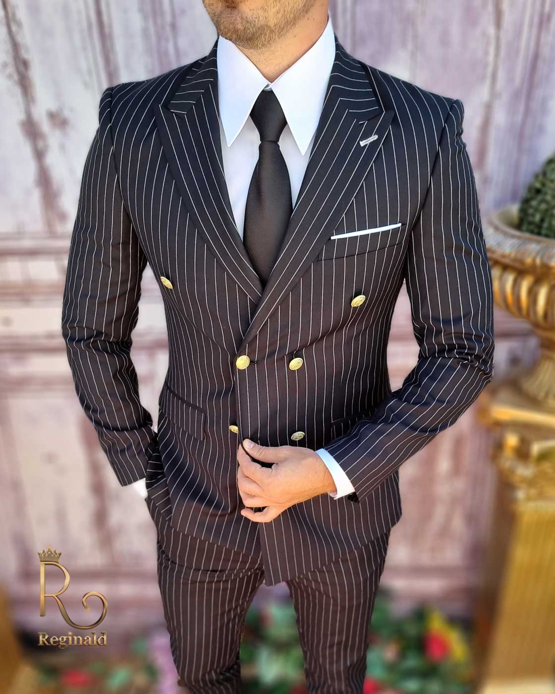 Costum de bărbați, Negru cu dungi albe, Sacou cu butoni aurii si Pantalon – C3690