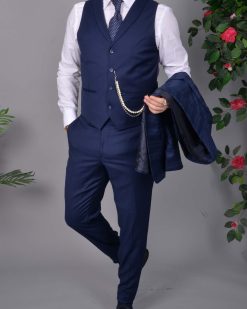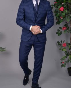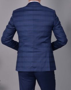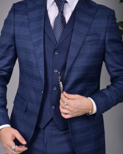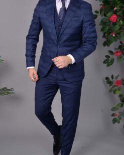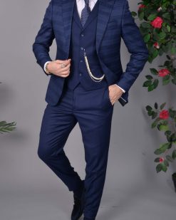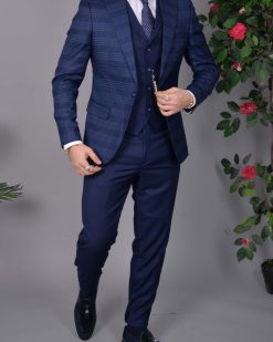 Costum de barbati, Slim Fit, Bleumarin in carouri, Sacou, Vesta si Pantalon – C1520
