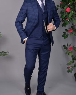 Costum de barbati, Slim Fit, Bleumarin in carouri, Sacou, Vesta si Pantalon – C1520