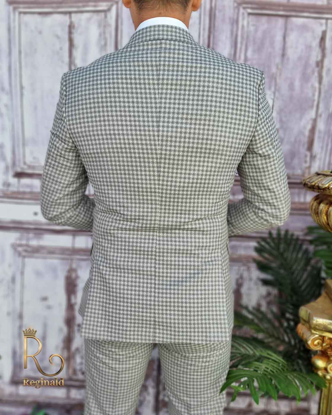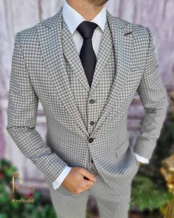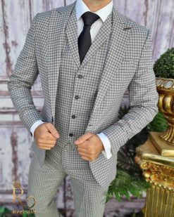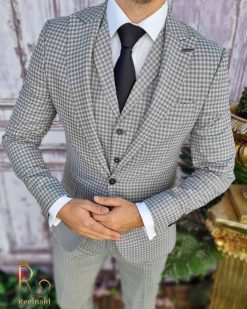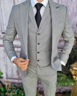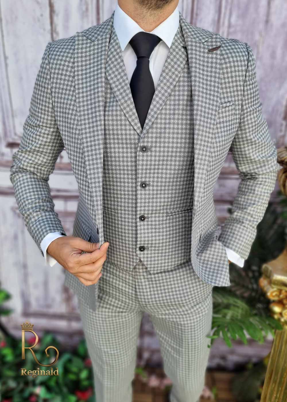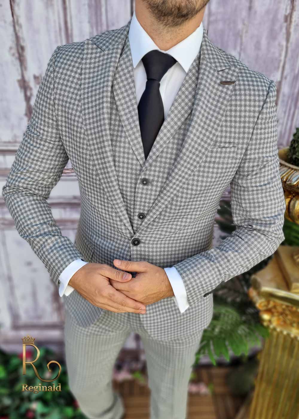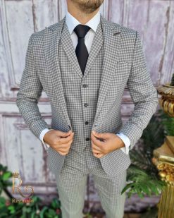 Costum de barbati slim-fit gri in carouri, Sacou+Vesta+Pantalon – C3373