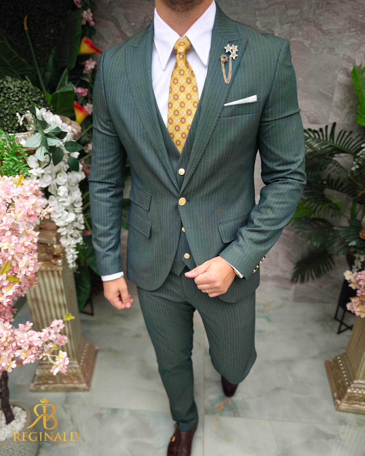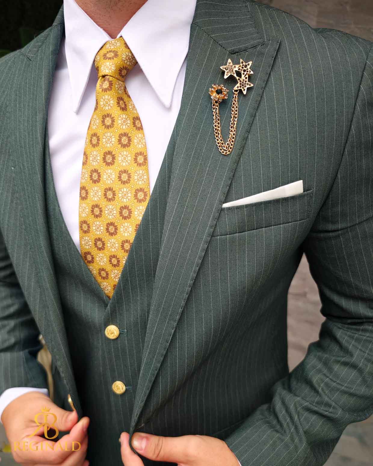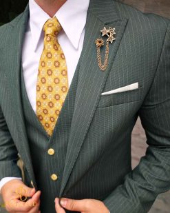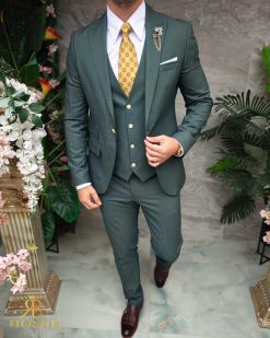 Costum de bărbați, verde cu dungi : Sacou, Vesta si Pantalon – C4970