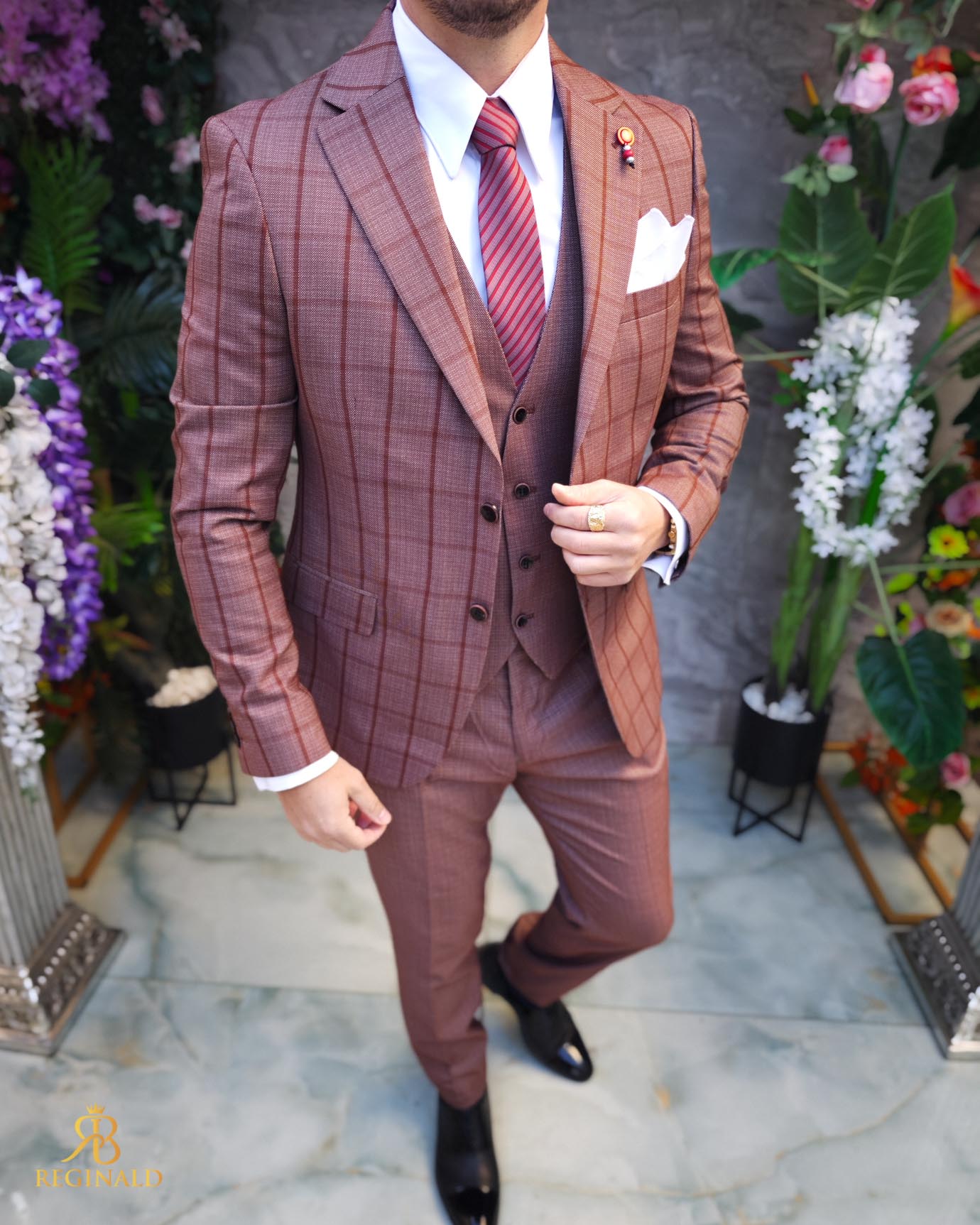 Costum de bărbați, Visiniu in carouri: Sacou, Vesta si Pantalon – C5140