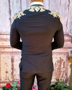 Culoarea: model negru cu pietre strălucitoare si broderii aurii aplicate pe sacou si cravata