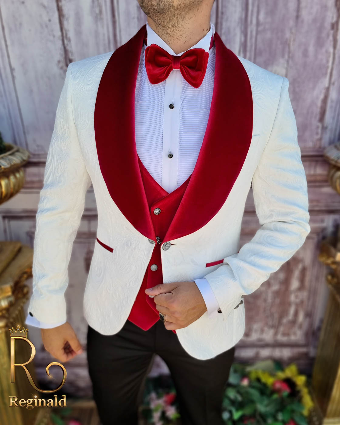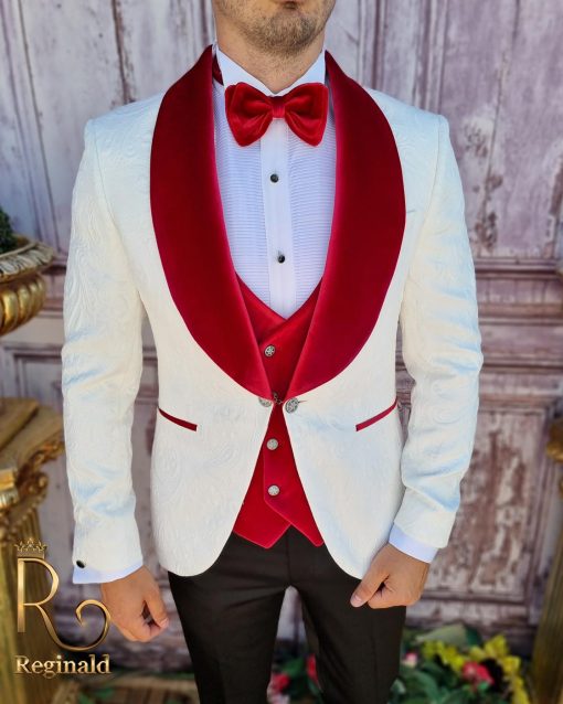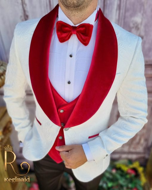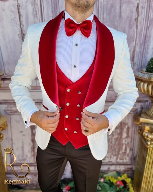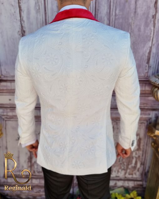 Sacoul este brodat in relief, cu rever din catifea, identic cu vesta