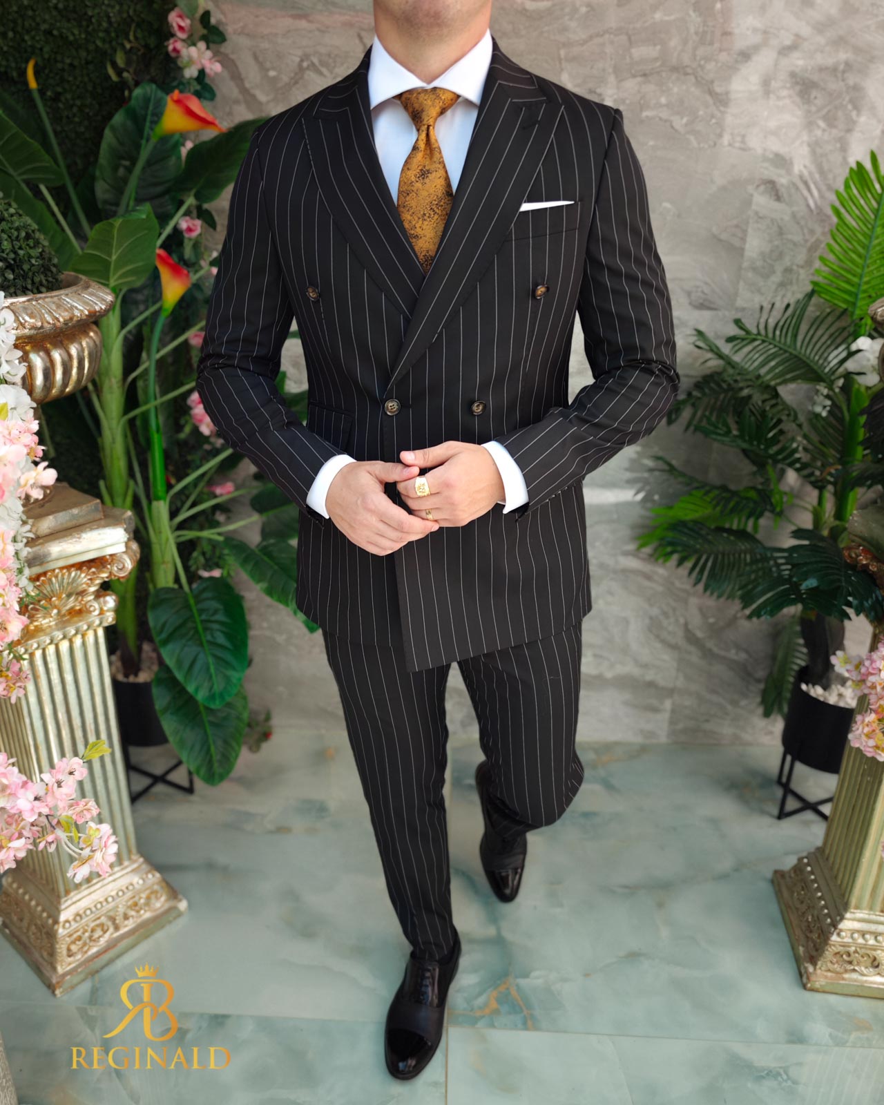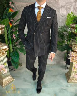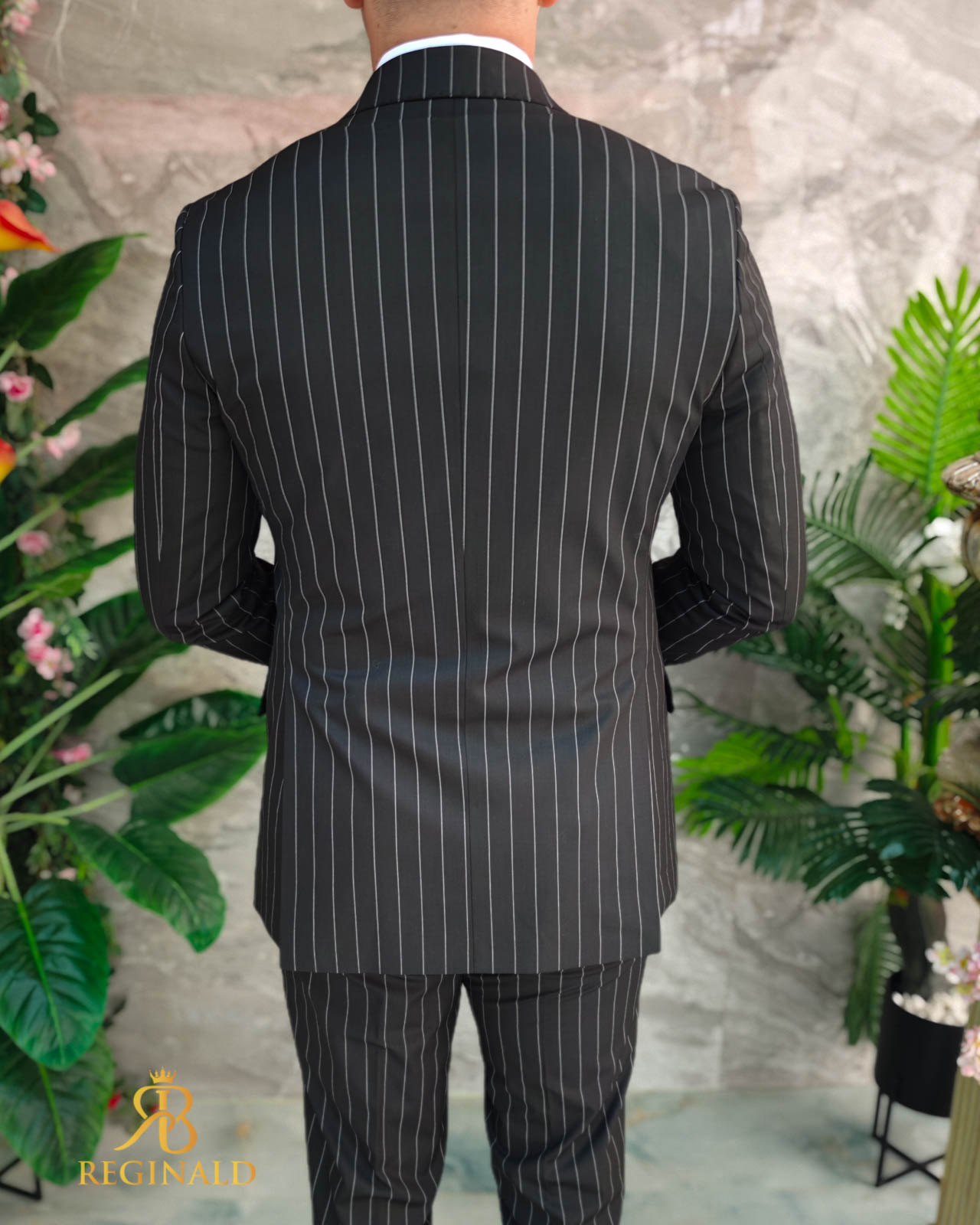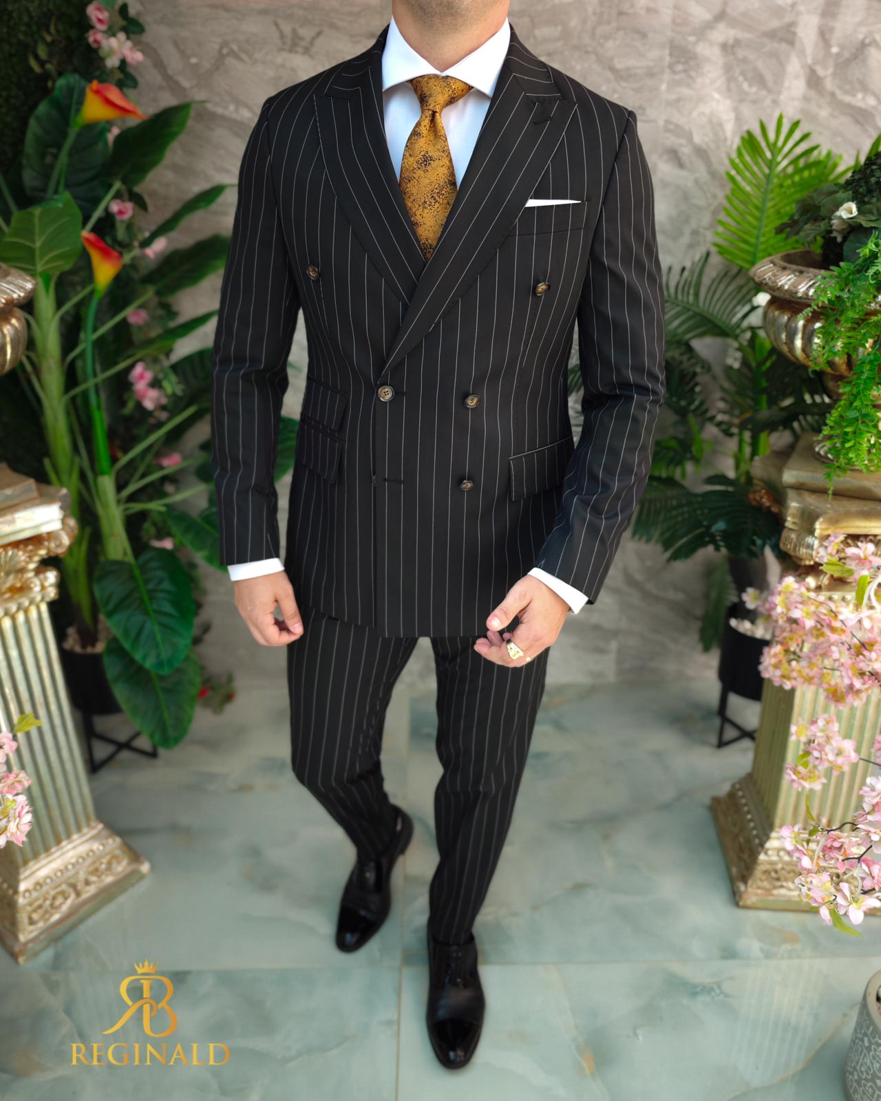 Costum Double Breasted, negru cu dungi albe- 100% Lana – C4943
