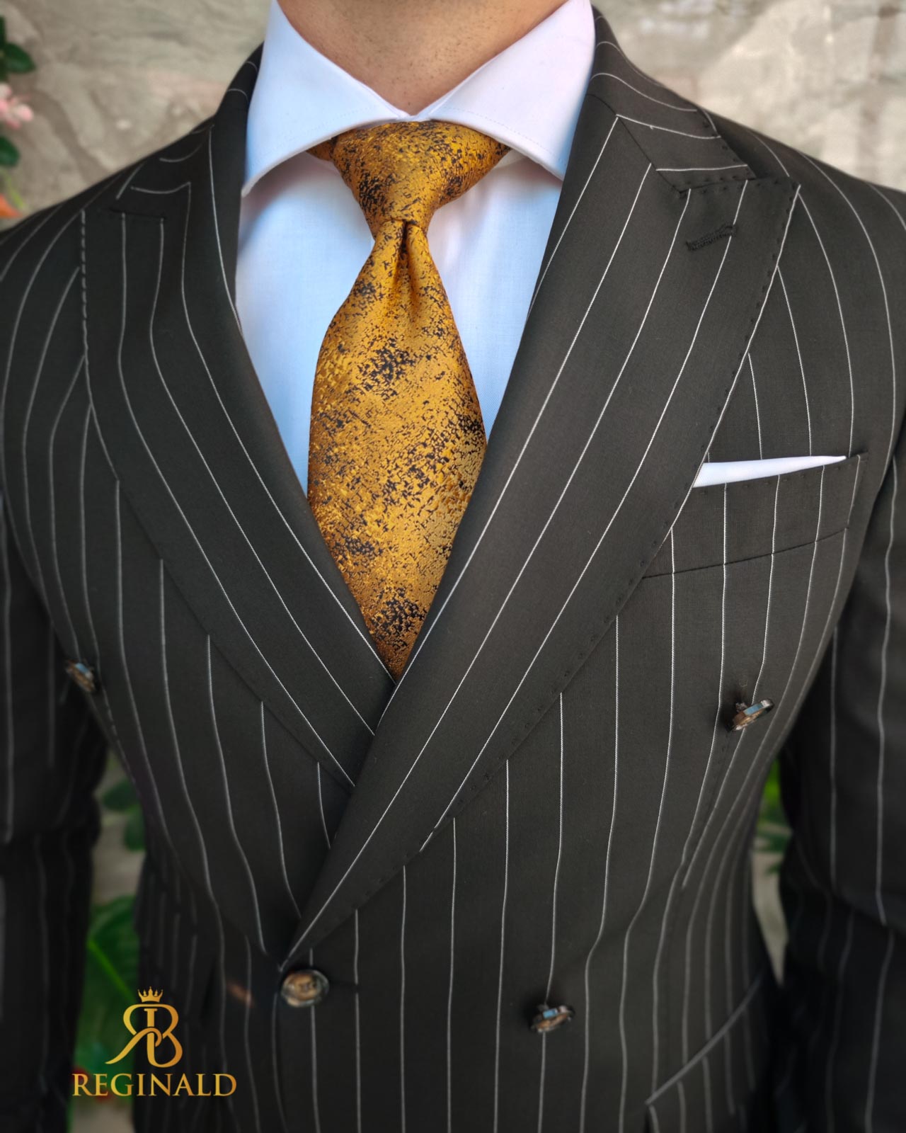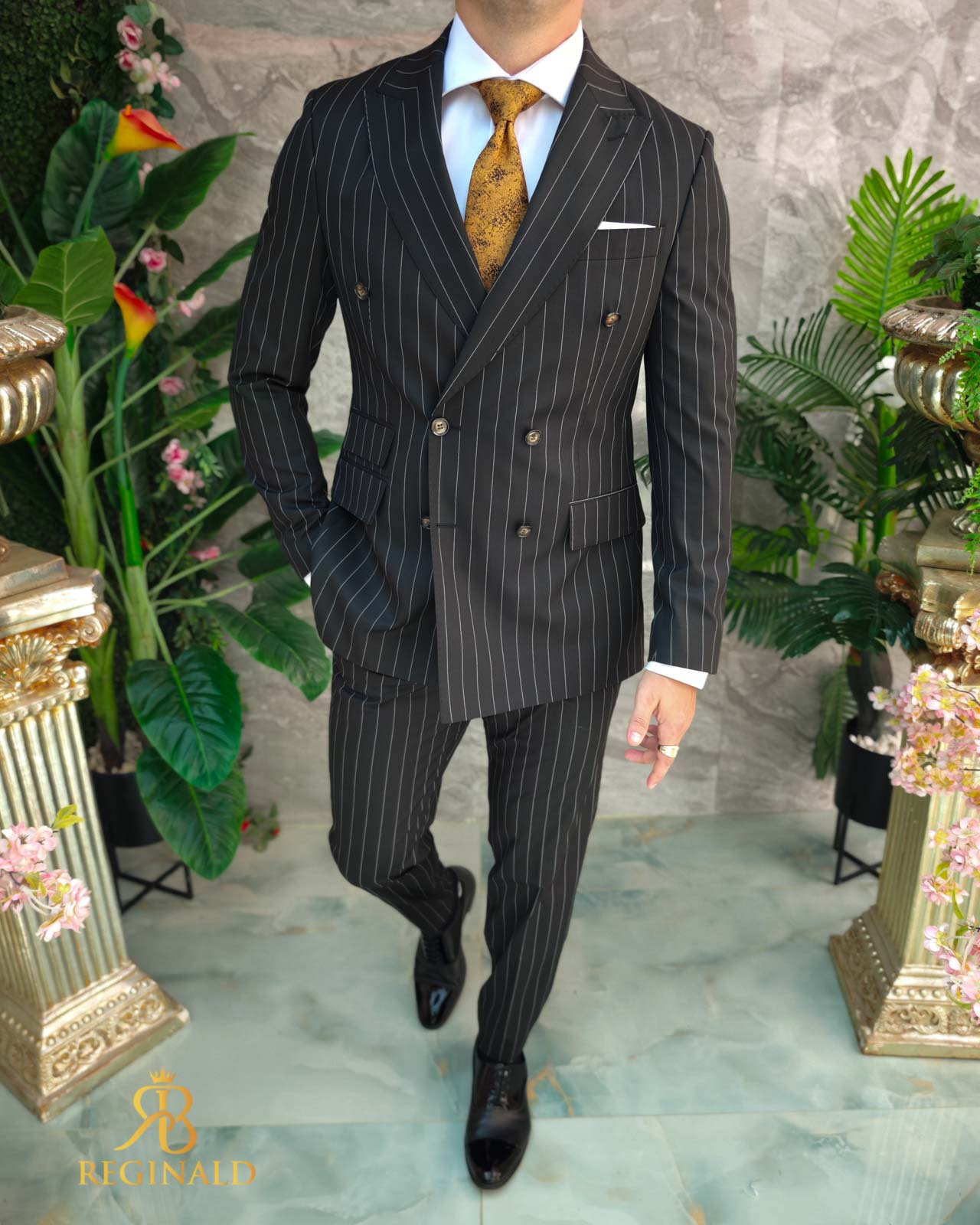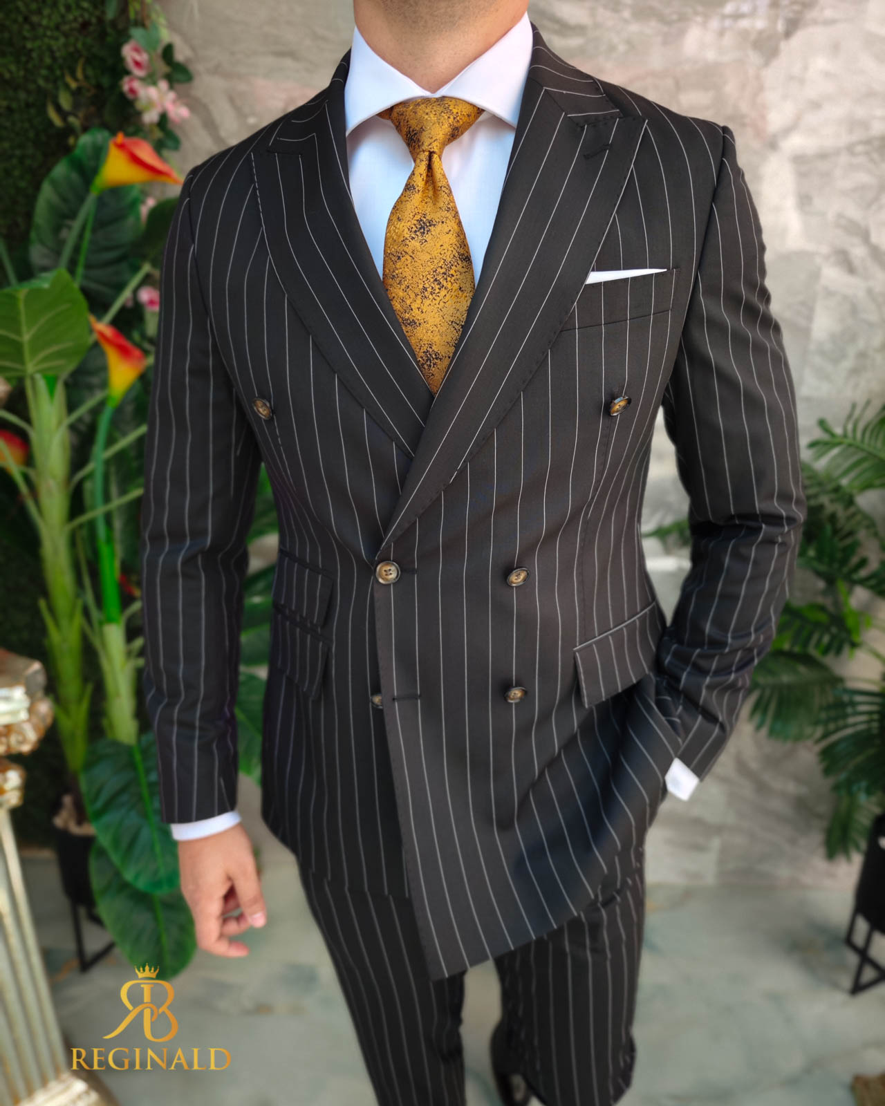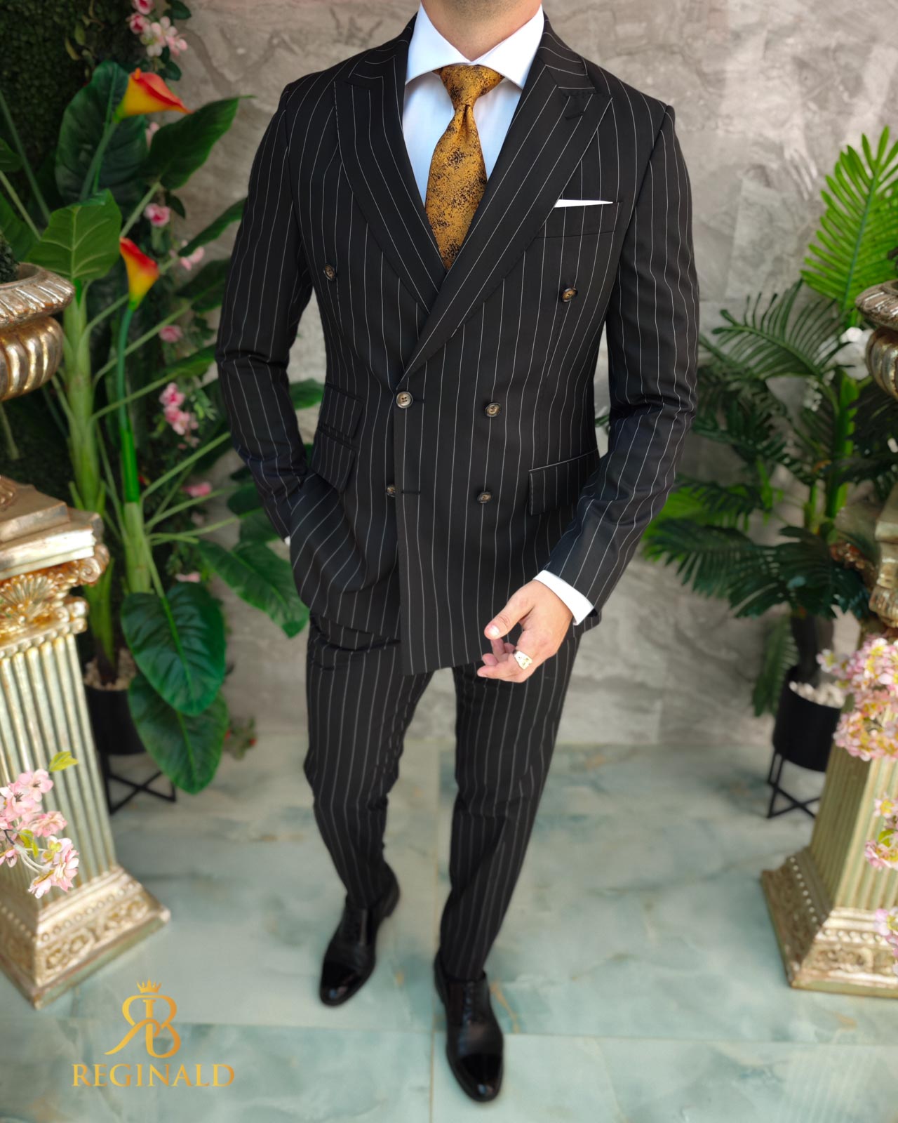Costum Double Breasted, negru cu dungi albe- 100% Lana – C4943