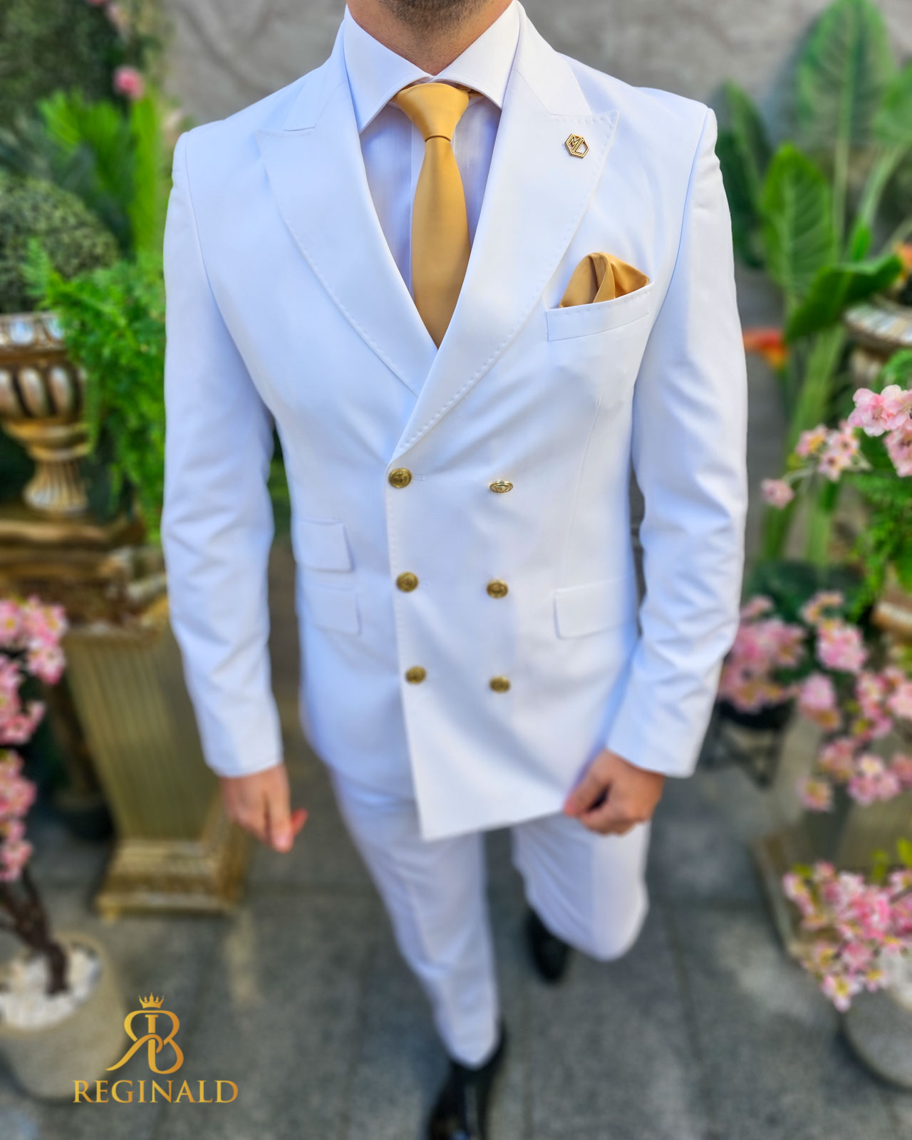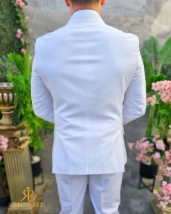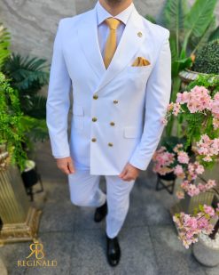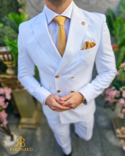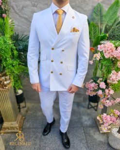 Costumul din imagine este o alegere elegantă și îndrăzneață pentru garderoba masculină. Este compus dintr-un sacou și pantaloni cu croiala slim fit, ceea ce sugerează o linie modernă și ajustată a ținutei. Confecționat dintr-un material care include 70% lână, acest costum emite calitate și confort, având o textură plăcută la atingere și o cădere frumoasă. Culoarea vibrantă de alb al costumului este accesorizată cu nasturi aurii, care se potrivesc perfect cu tonul vibrant și adaugă un accent regal. Sacoul are un design cu două rânduri de nasturi și rever lat, care contribuie la un profil clasic și sofisticat. Pantalonii, de asemenea în culoare alba, completează ansamblul cu un stil curat și o potrivire perfectă. Detalii precum batista alba din buzunarul pieptului sacoului și bijuteriile discrete completează acest look distins. Este o ținută potrivită pentru ocazii formale, evenimente de afaceri sau alte momente speciale care necesită un îmbrăcăminte de impact.