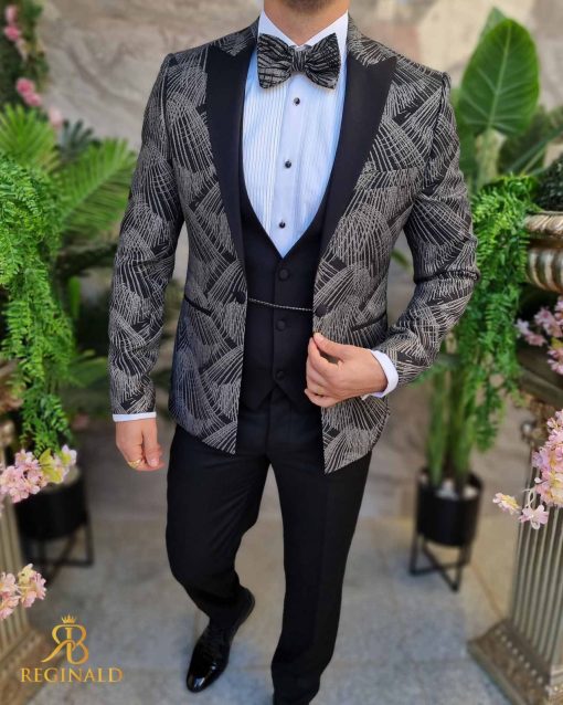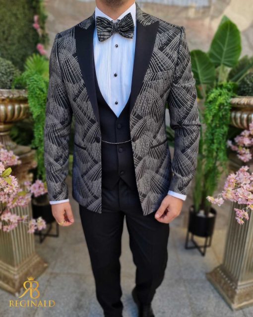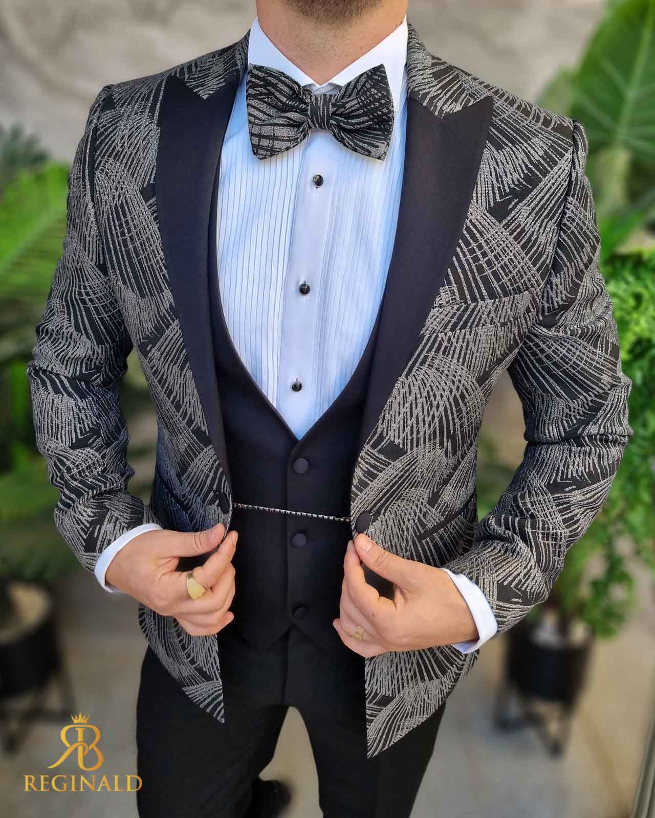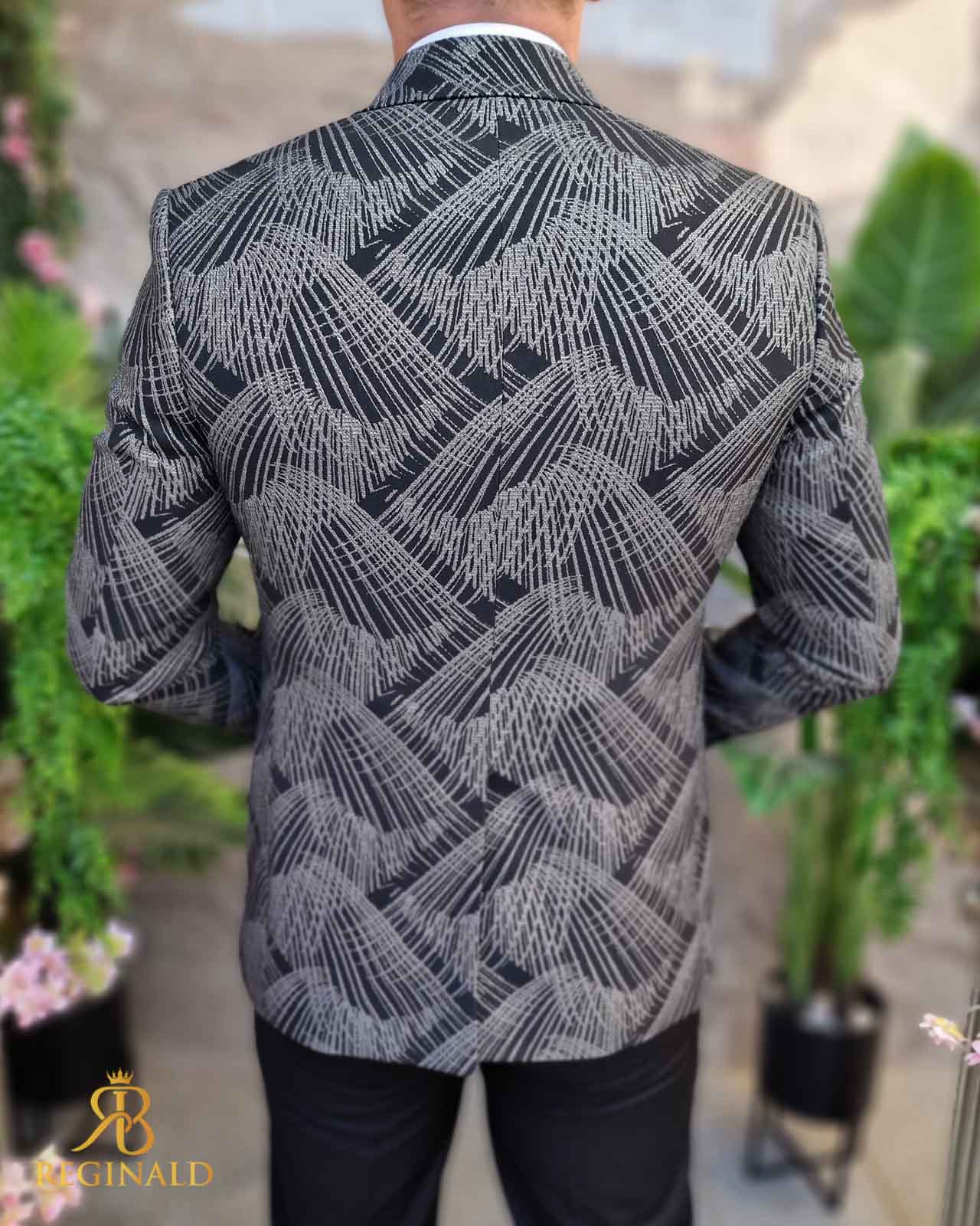 Sacoul este cu rever negru satin, model imprimat pe sacou