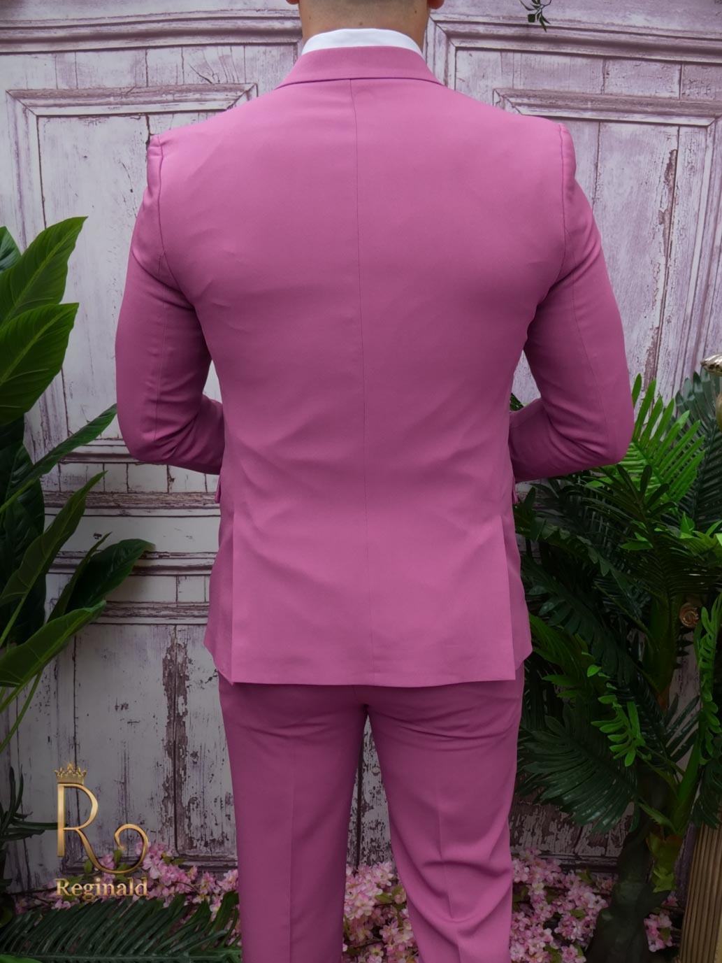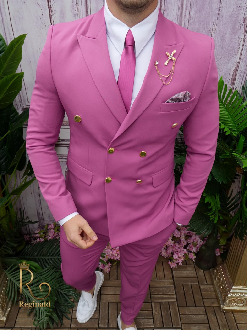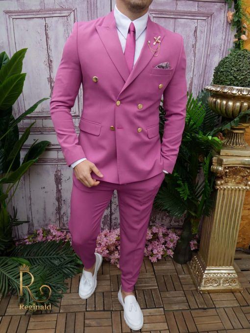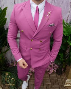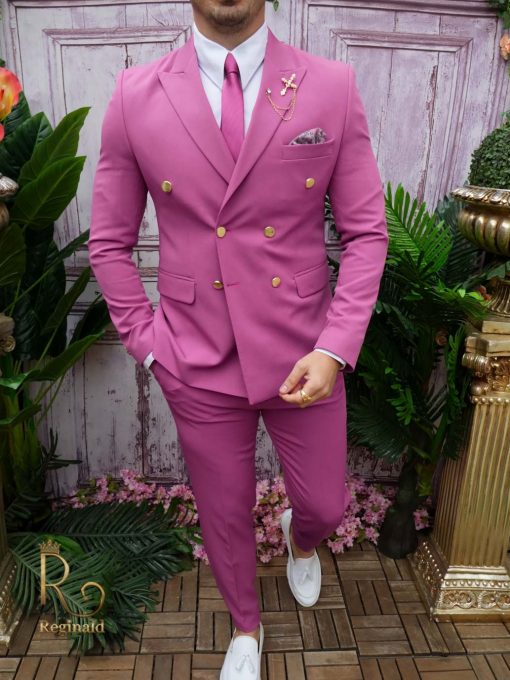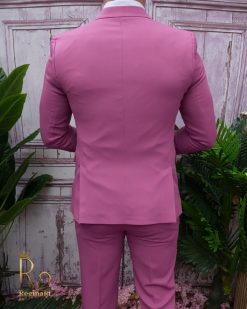 Costumul pentru bărbați este de culoare mov lila, ceea ce îi conferă o notă de eleganță și rafinament. Croiala este slim-fit, ceea ce înseamnă că este potrivit pentru un stil modern și aerisit. Sacoul are nasturi metalici aurii, care adaugă un aspect de lux și strălucire, iar pantalonii sunt la fel de bine croiți pentru a se potrivi perfect cu sacoul. Împreună, costumul creează un aspect sofisticat și deosebit de elegant.